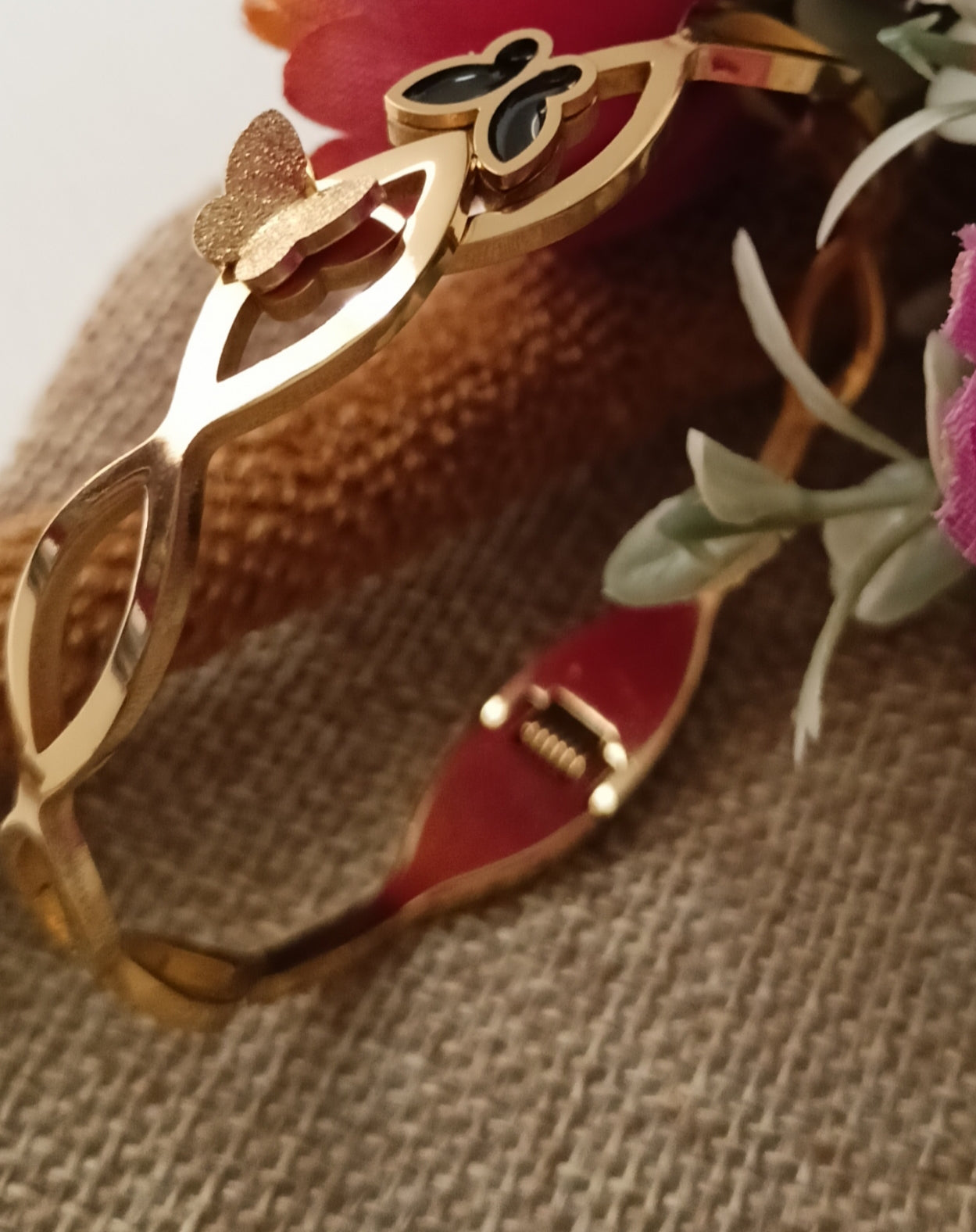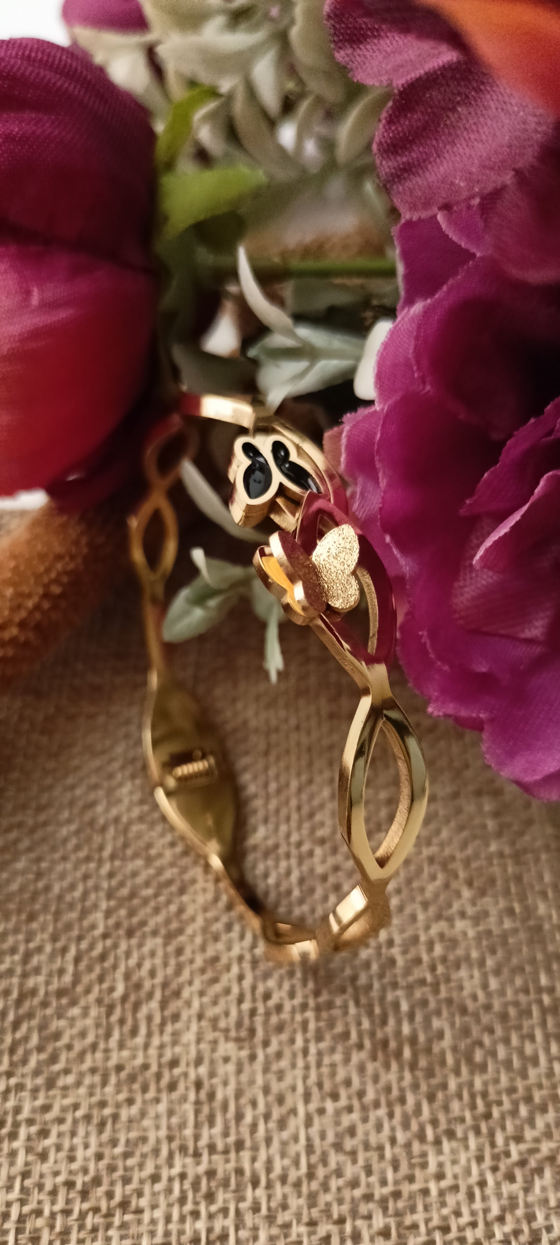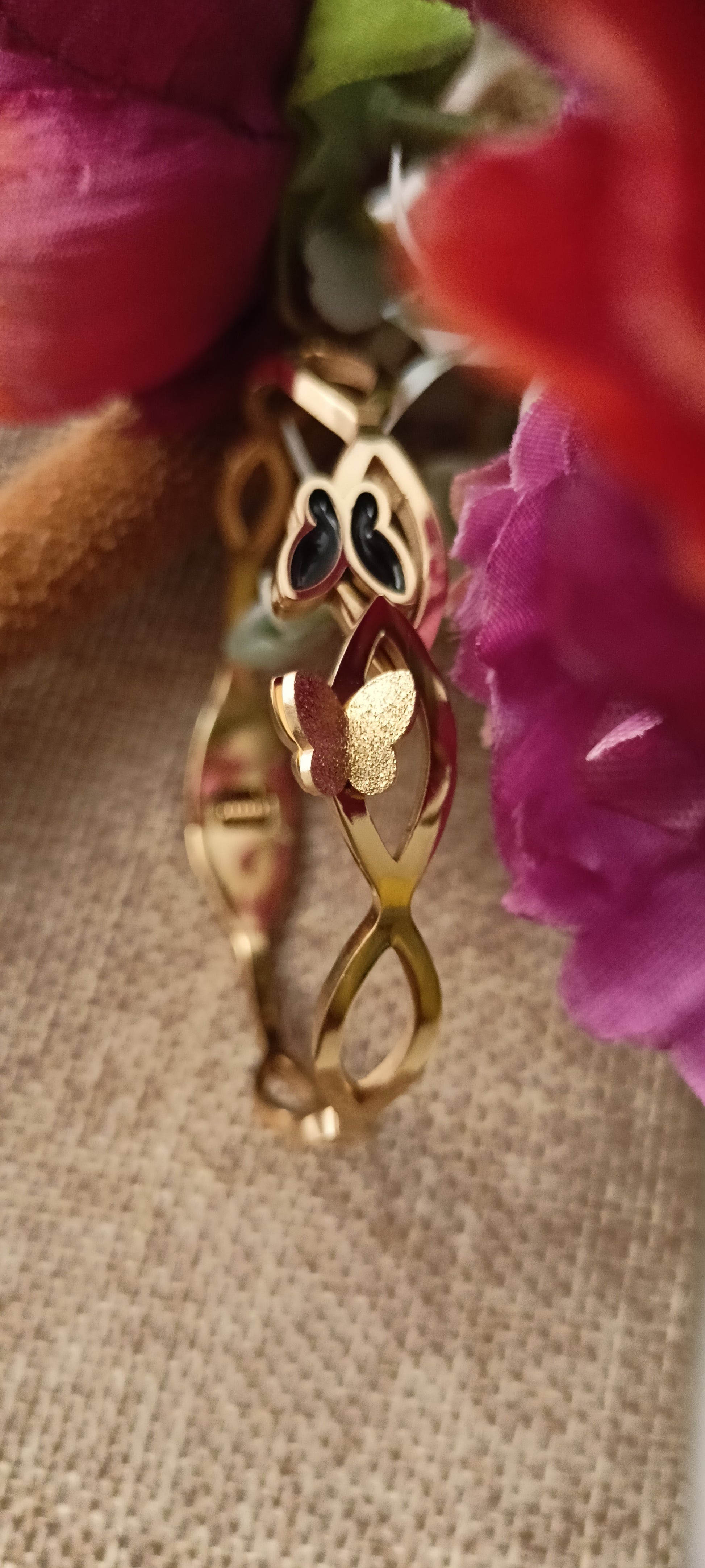 This bracelet features a sleek anti-tarnish gold-tone design, highlighted with a gold butterfly and a black enamel butterfly for a touch of luxury. Its modern and minimalistic style makes it a versatile accessory, perfect for elevating both casual and formal outfits.