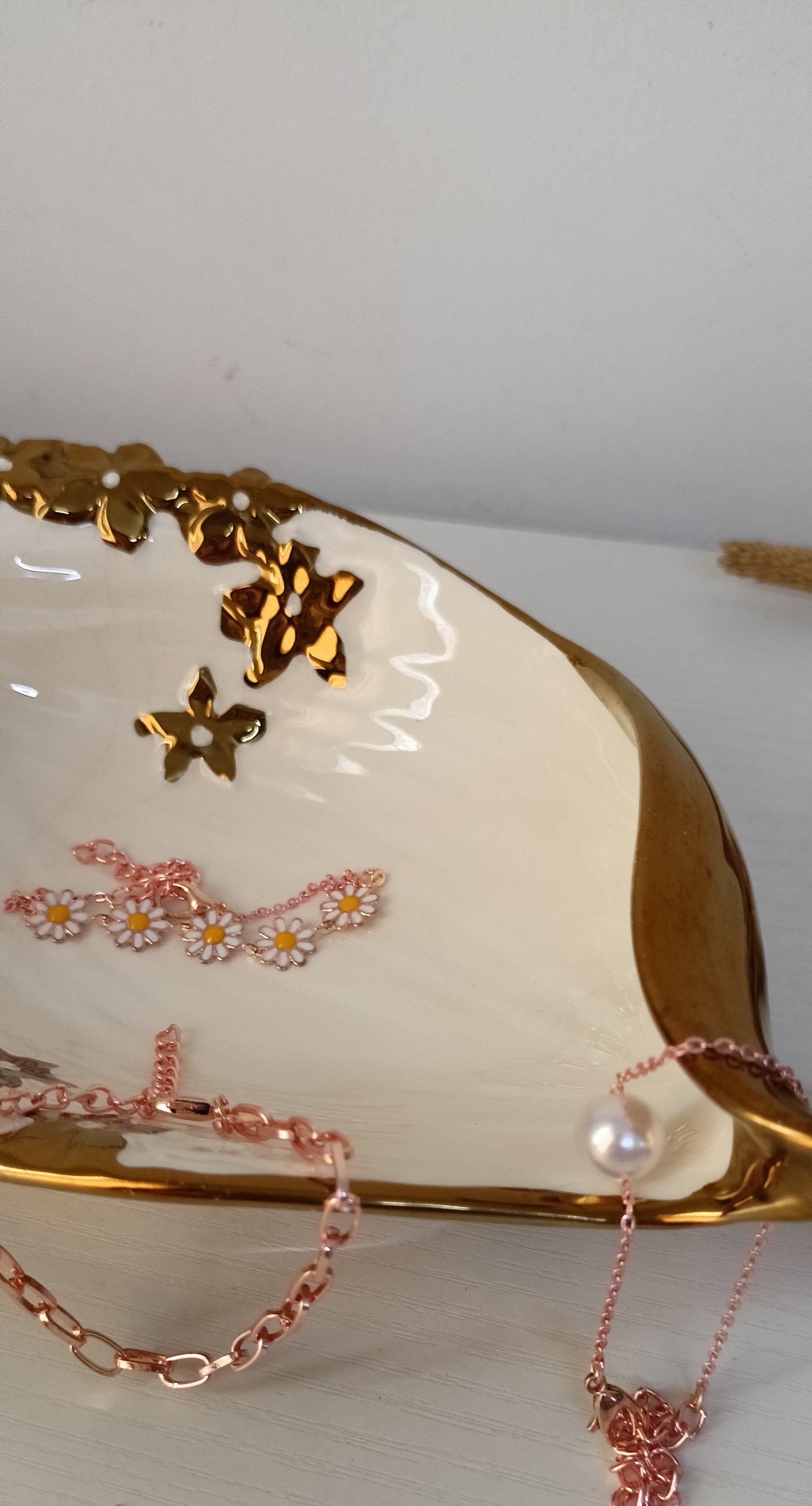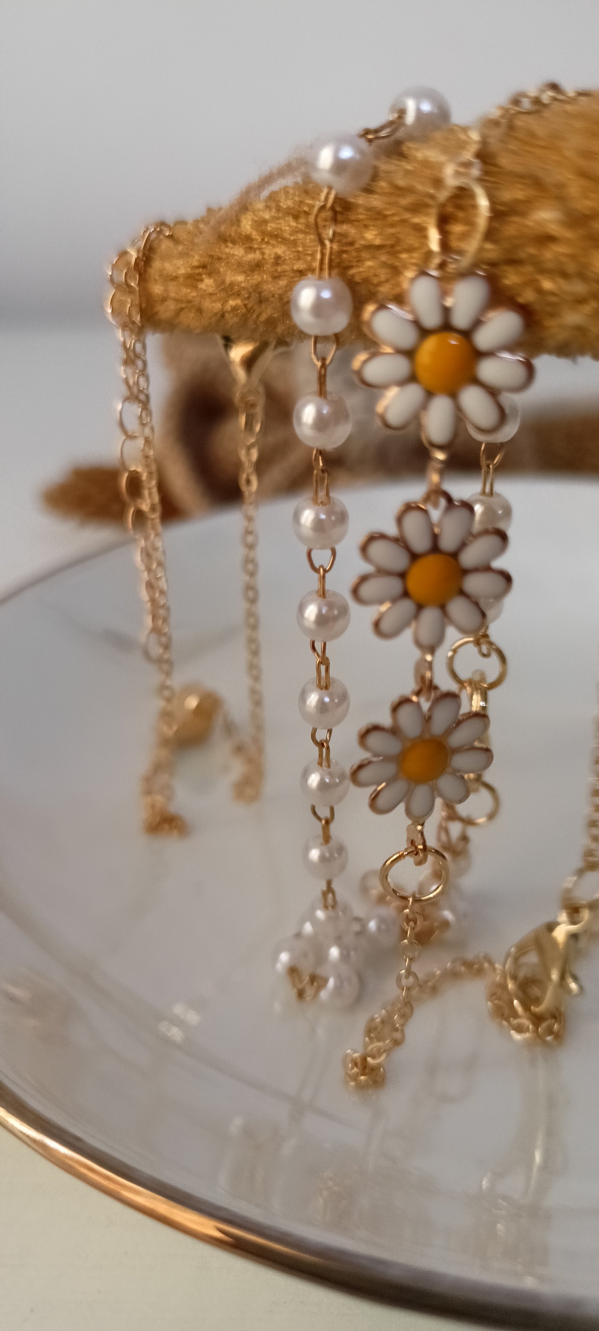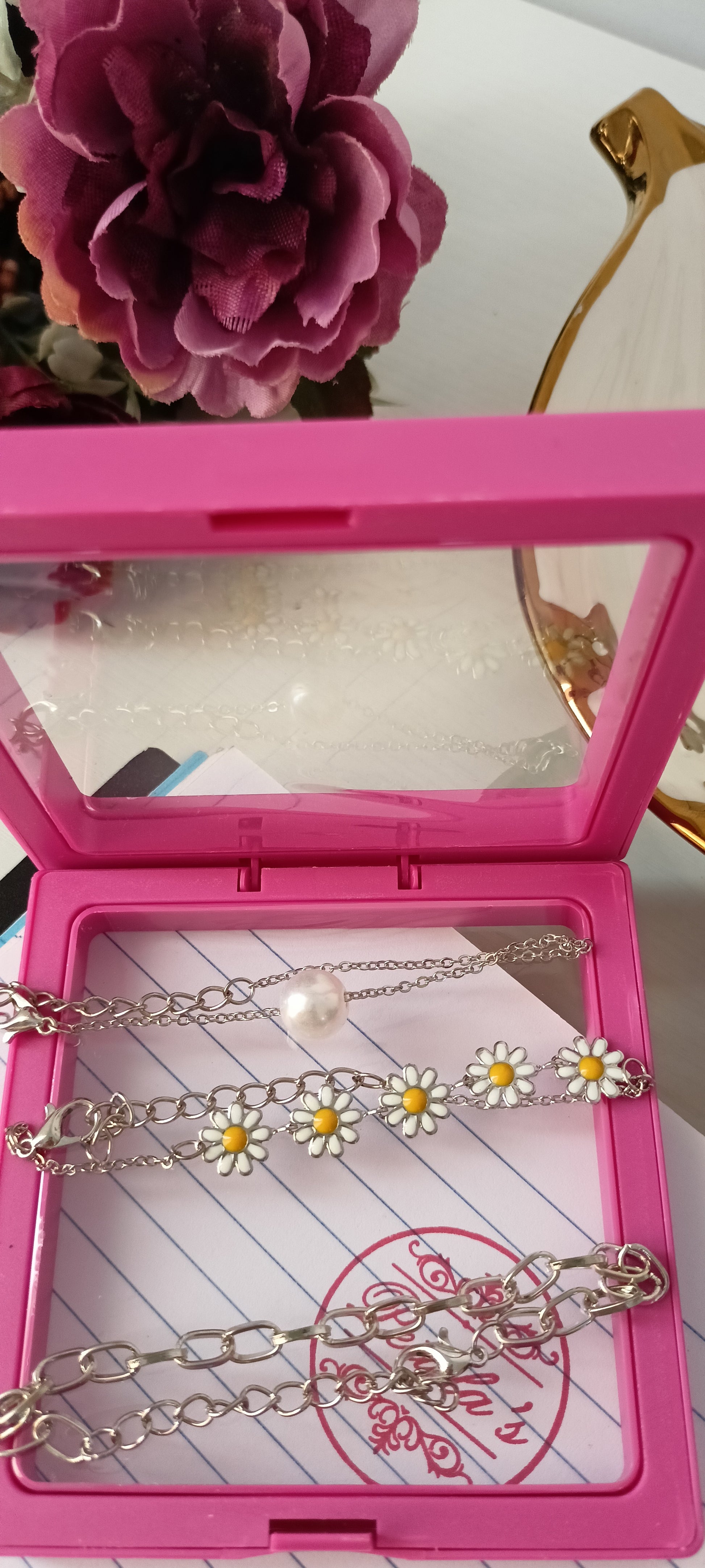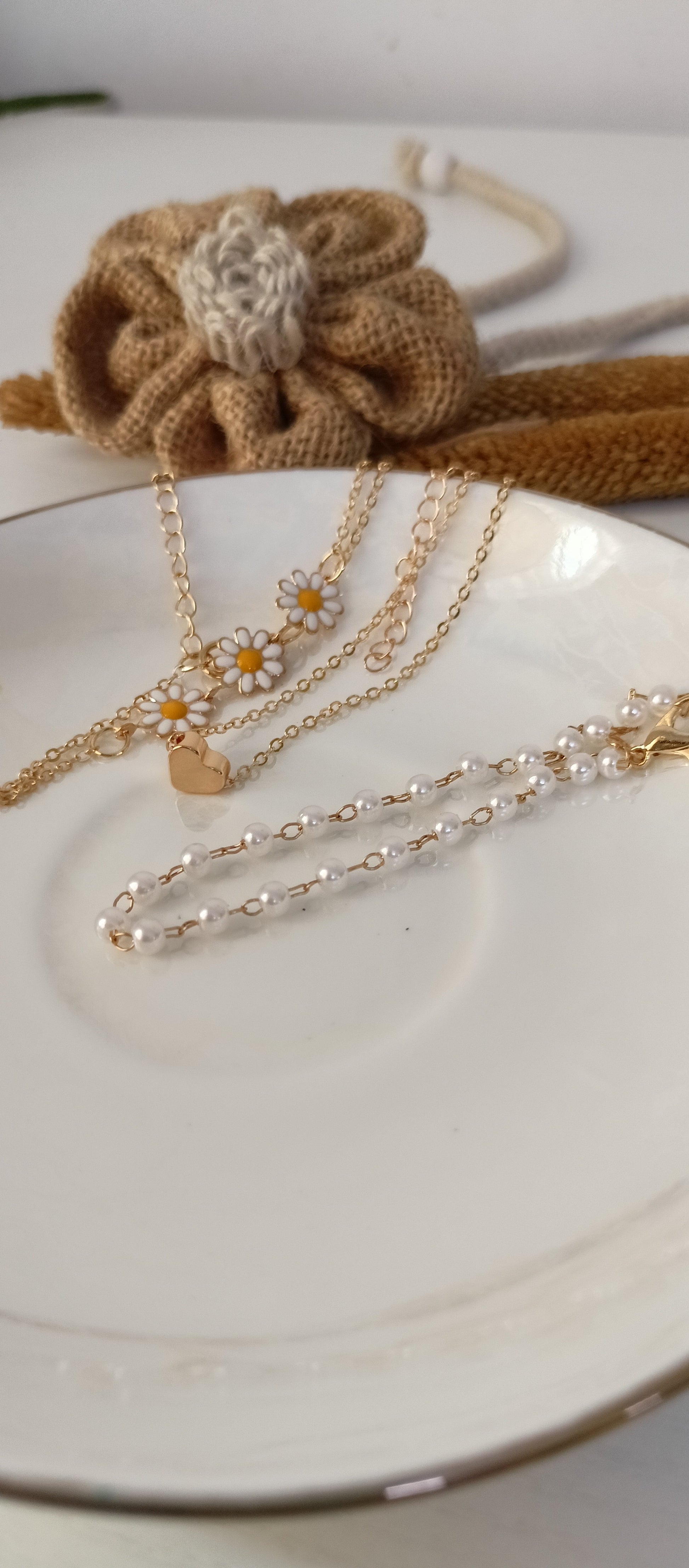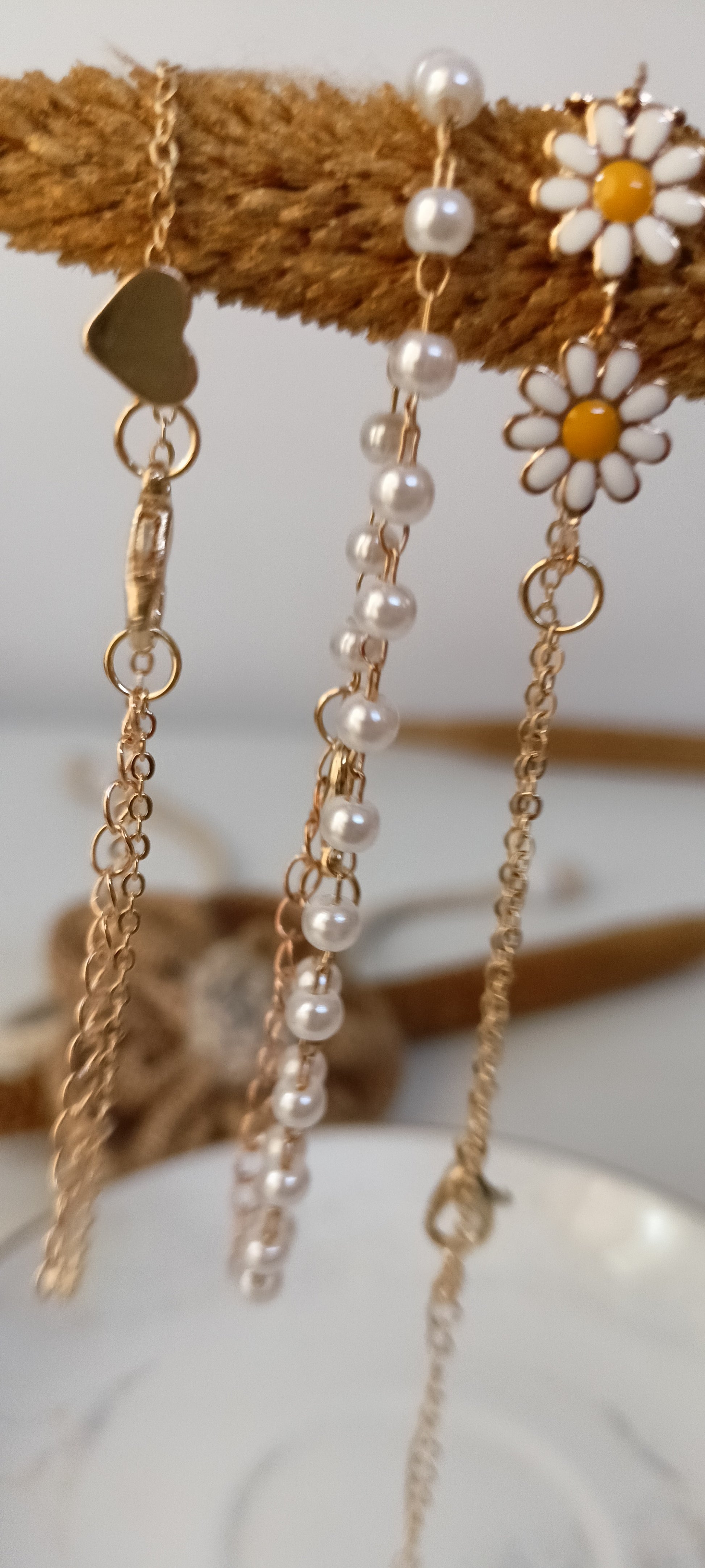 This charming bracelet set features three unique designs on delicate gold-tone chains: a sleek heart charm bracelet, a classic chain with luminous white faux pearls, and a playful daisy flower chain with cheerful yellow centers. Each bracelet can be worn alone for a subtle accent or stacked together for a fun, bohemian-inspired look. Perfect for adding a touch of whimsy and brightness to any outfit.