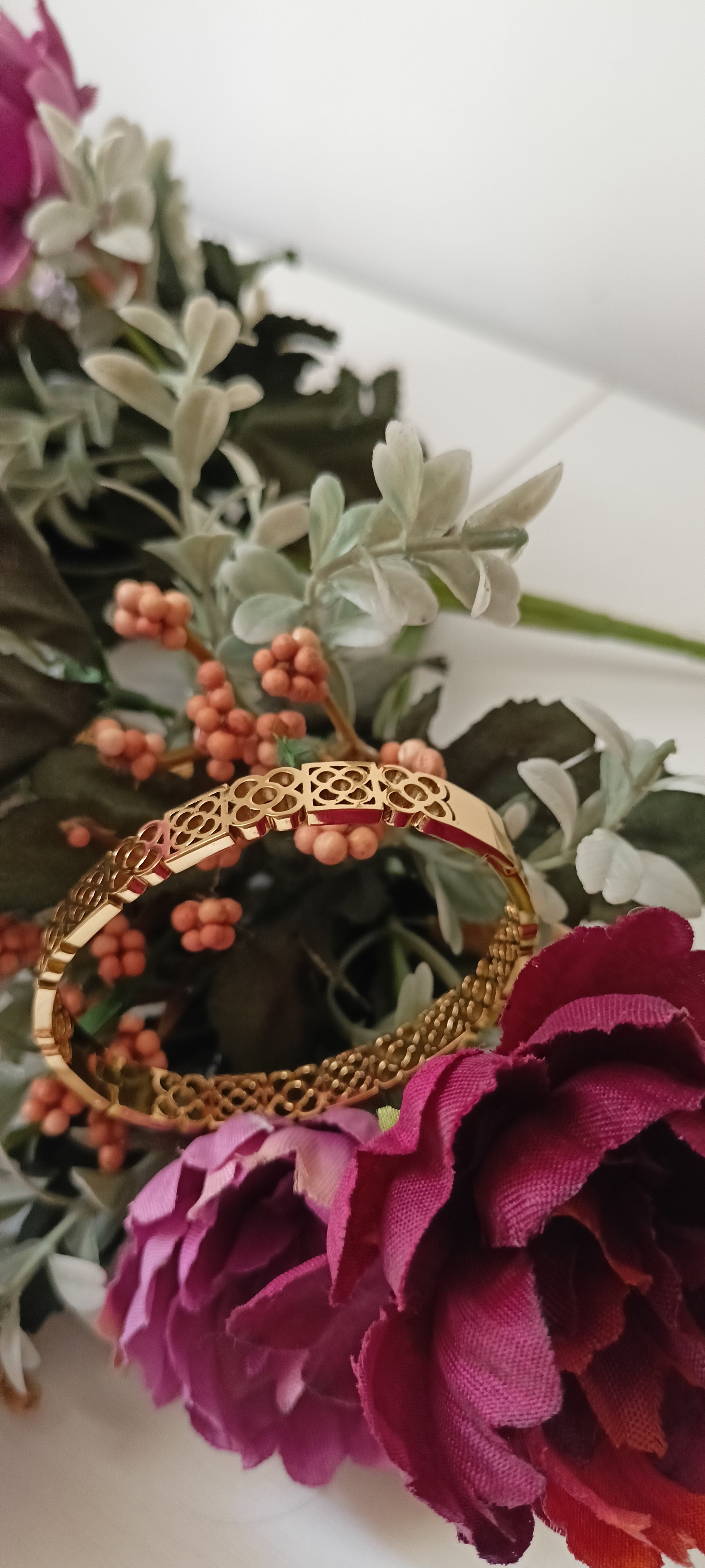 This exquisite bracelet showcases an intricate openwork design featuring delicate floral and geometric patterns throughout its gold-tone band. The ornate cutout details create a sophisticated lattice effect, while hints of burgundy accents add depth and richness to the overall aesthetic. Perfect for special occasions or adding a touch of vintage-inspired elegance to any ensemble.