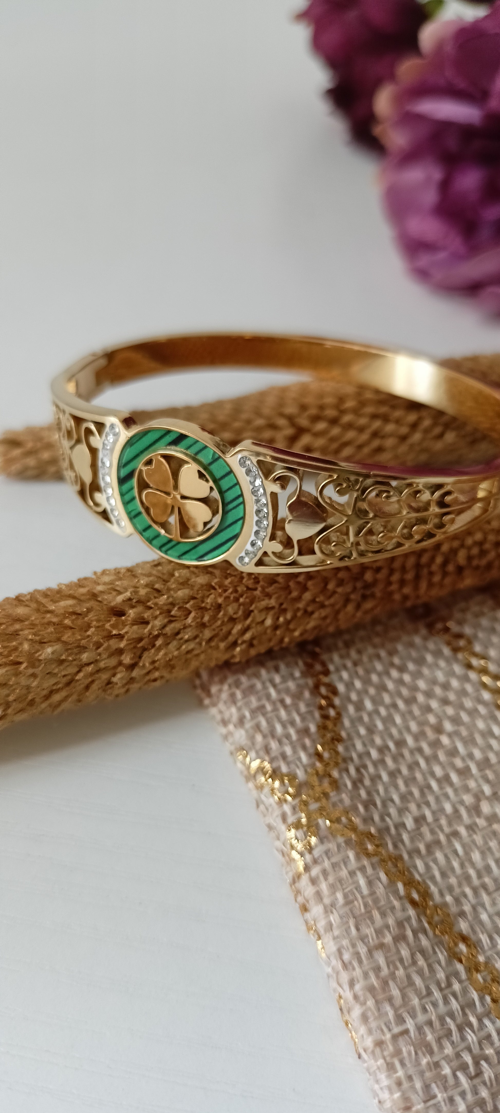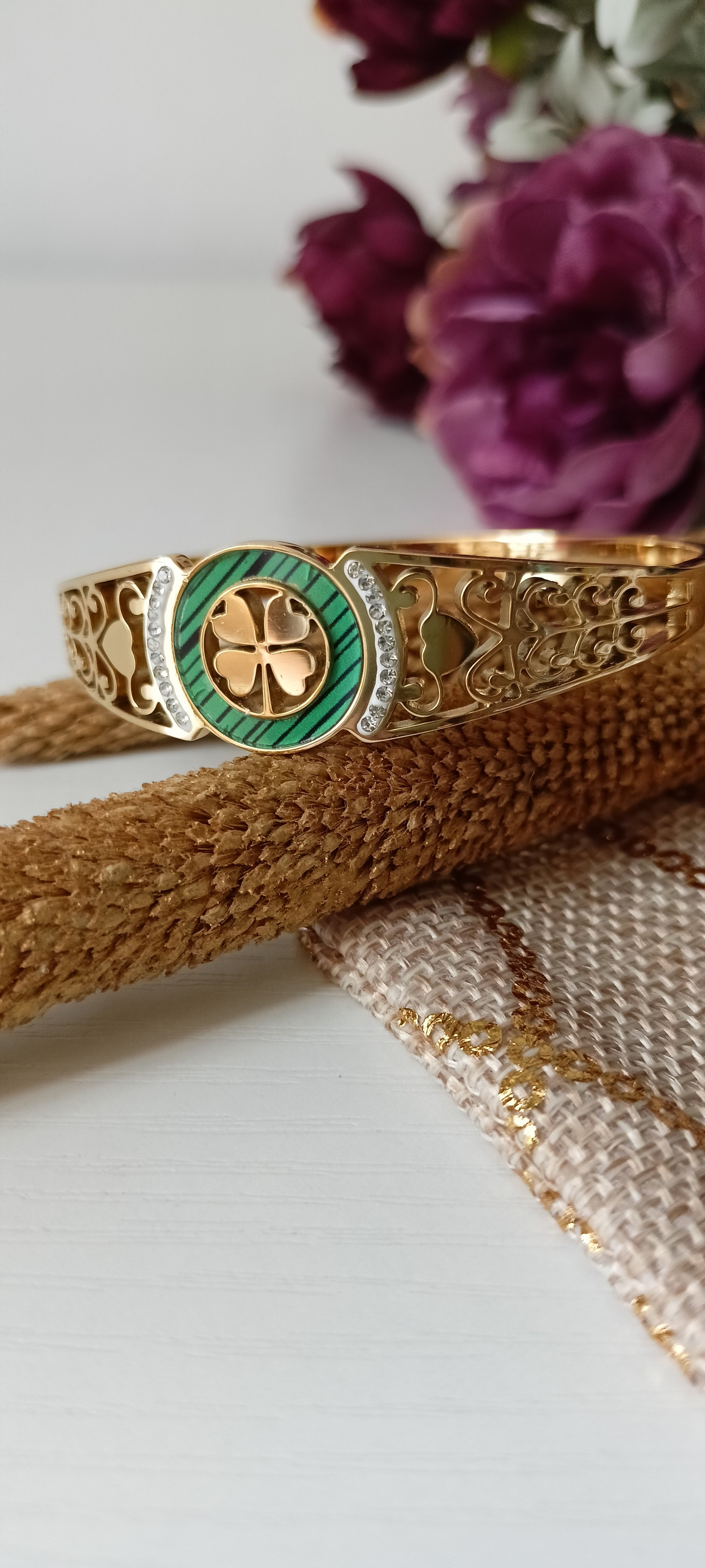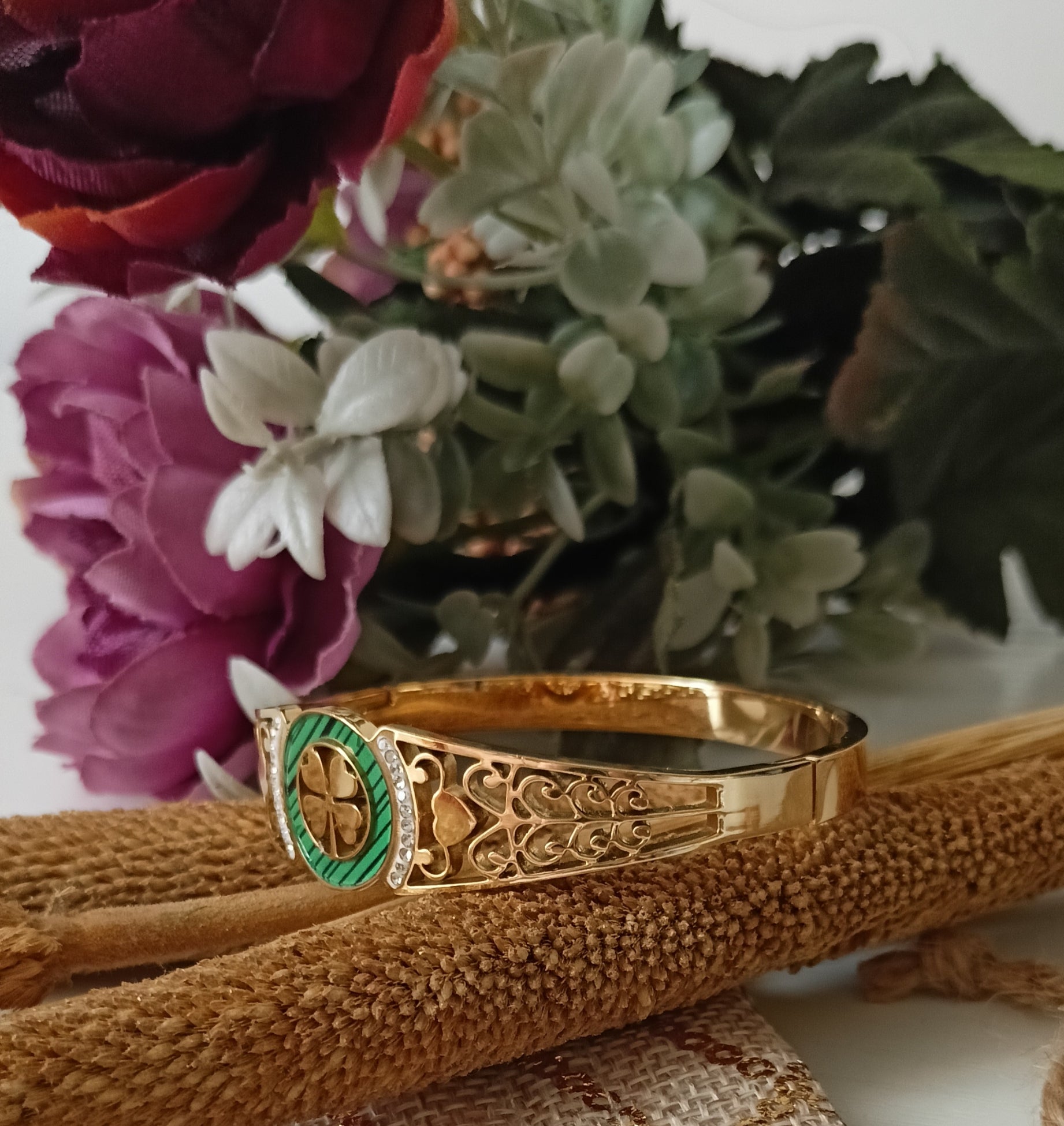 This eye-catching bracelet features a gold-tone band with intricate filigree detailing on the sides, accented by a vivid green circular center piece with a four-leaf clover motif. Sparkling crystal embellishments frame the center piece, adding a touch of elegance and charm—perfect for making a statement or gifting good wishes!
