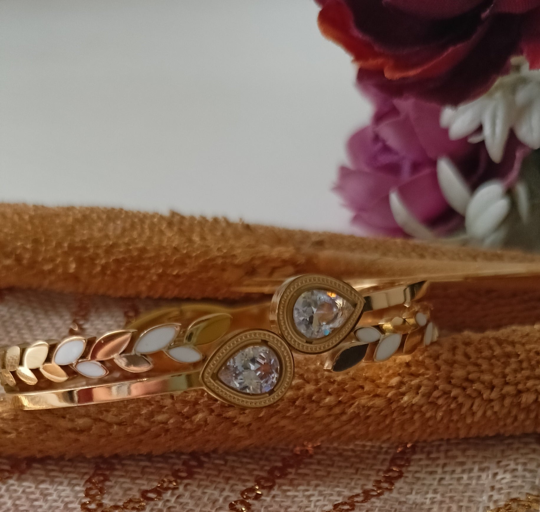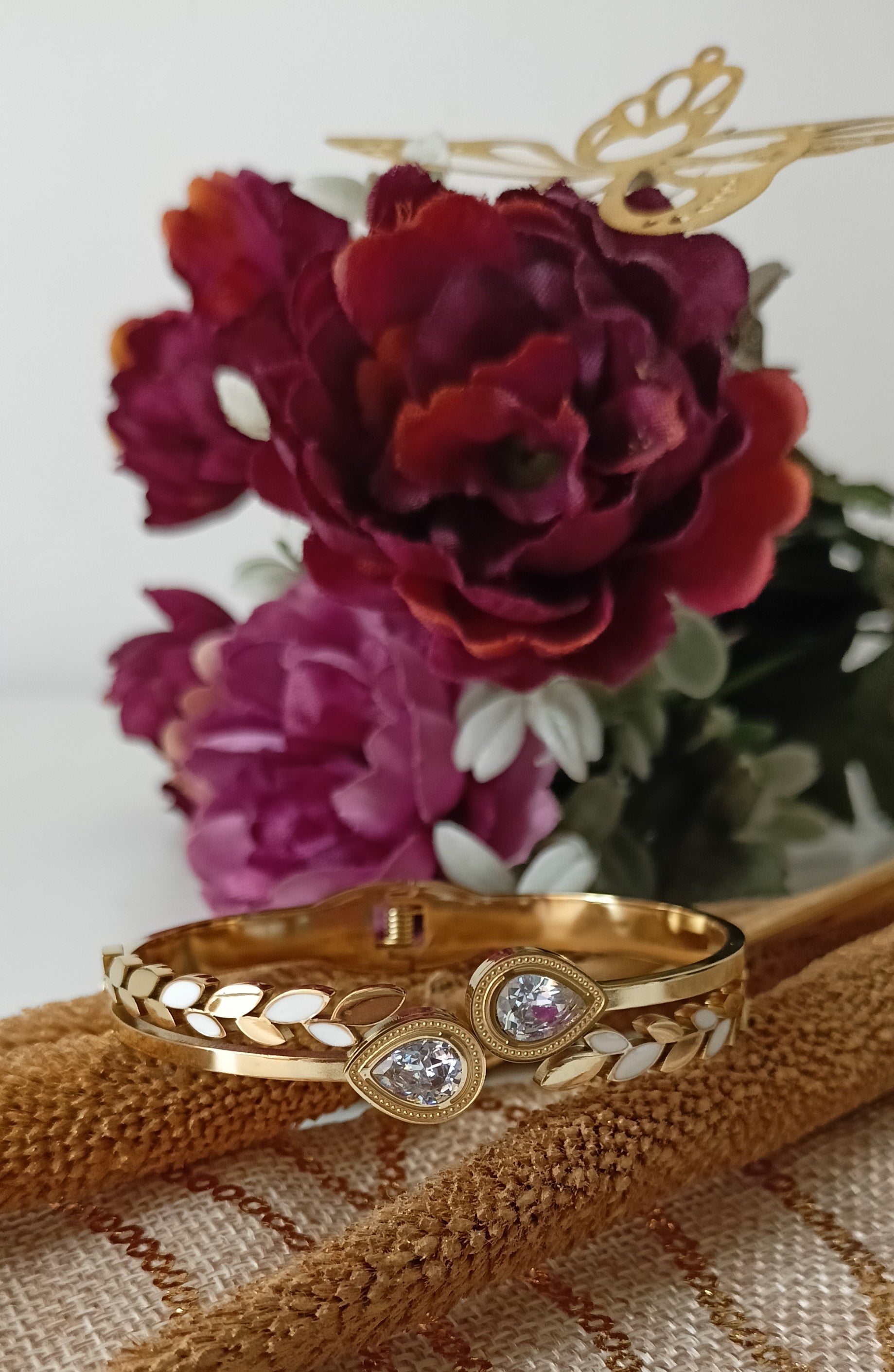This elegant bracelet features a radiant gold-tone band with delicate white enamel leaf accents and two teardrop-shaped sparkling stones as the centerpiece. The refined leaf motif and shimmering gems create a sophisticated look, making this accessory perfect for both everyday elegance and special occasions.