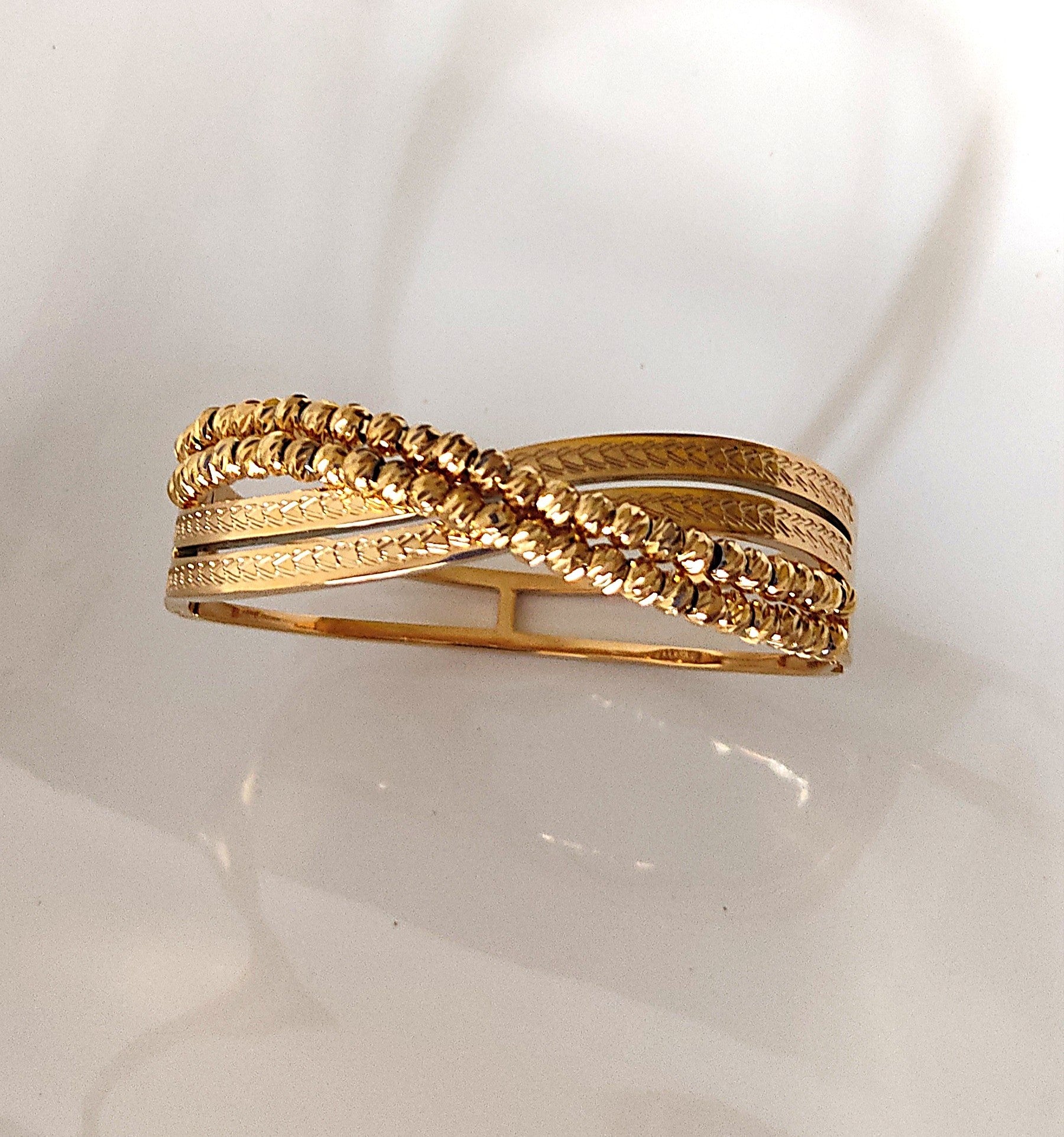 Showcase refined elegance with this dual texture gold-plated bangle bracelet, featuring a unique crossover design. Delicate rotating beaded accents and engraved leafy patterns blend beautifully for a timeless look that’s perfect for everyday wear or special occasions.
