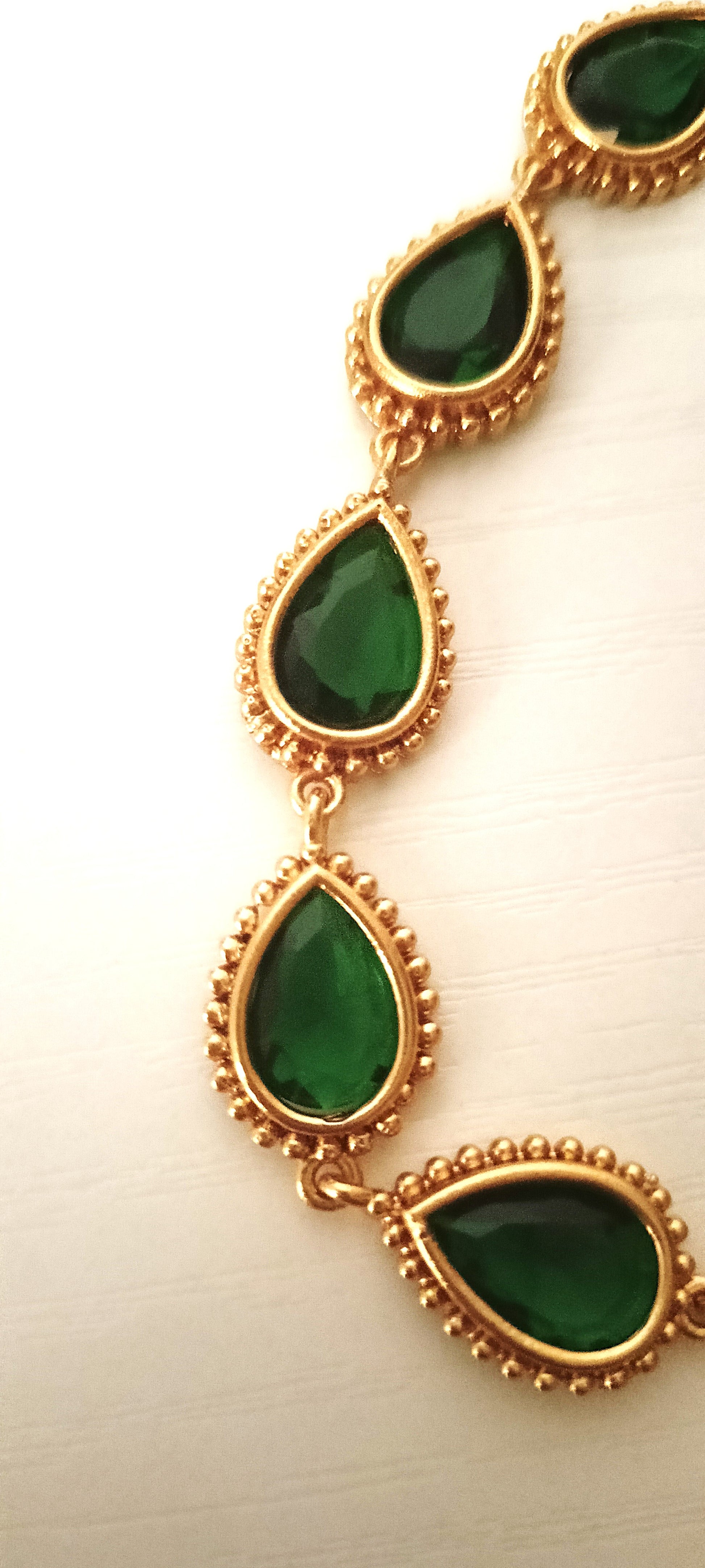 A beautifully crafted green stone necklace set featuring teardrop-shaped emerald, green stones bordered with gold detailing. Complete with a matching pair of earrings and a statement pendant, this set adds a touch of royal charm to weddings, festive occasions, and special celebrations.