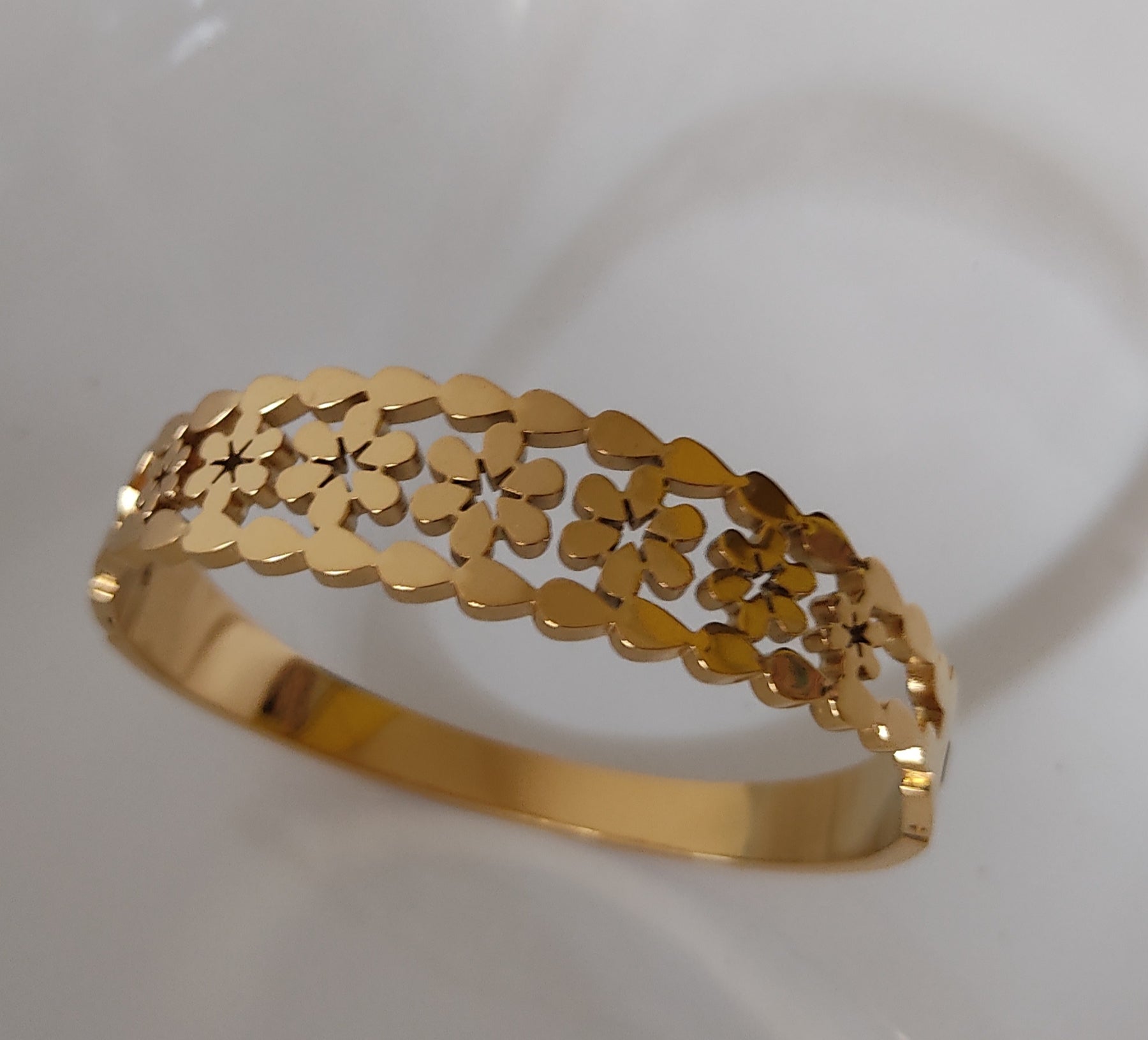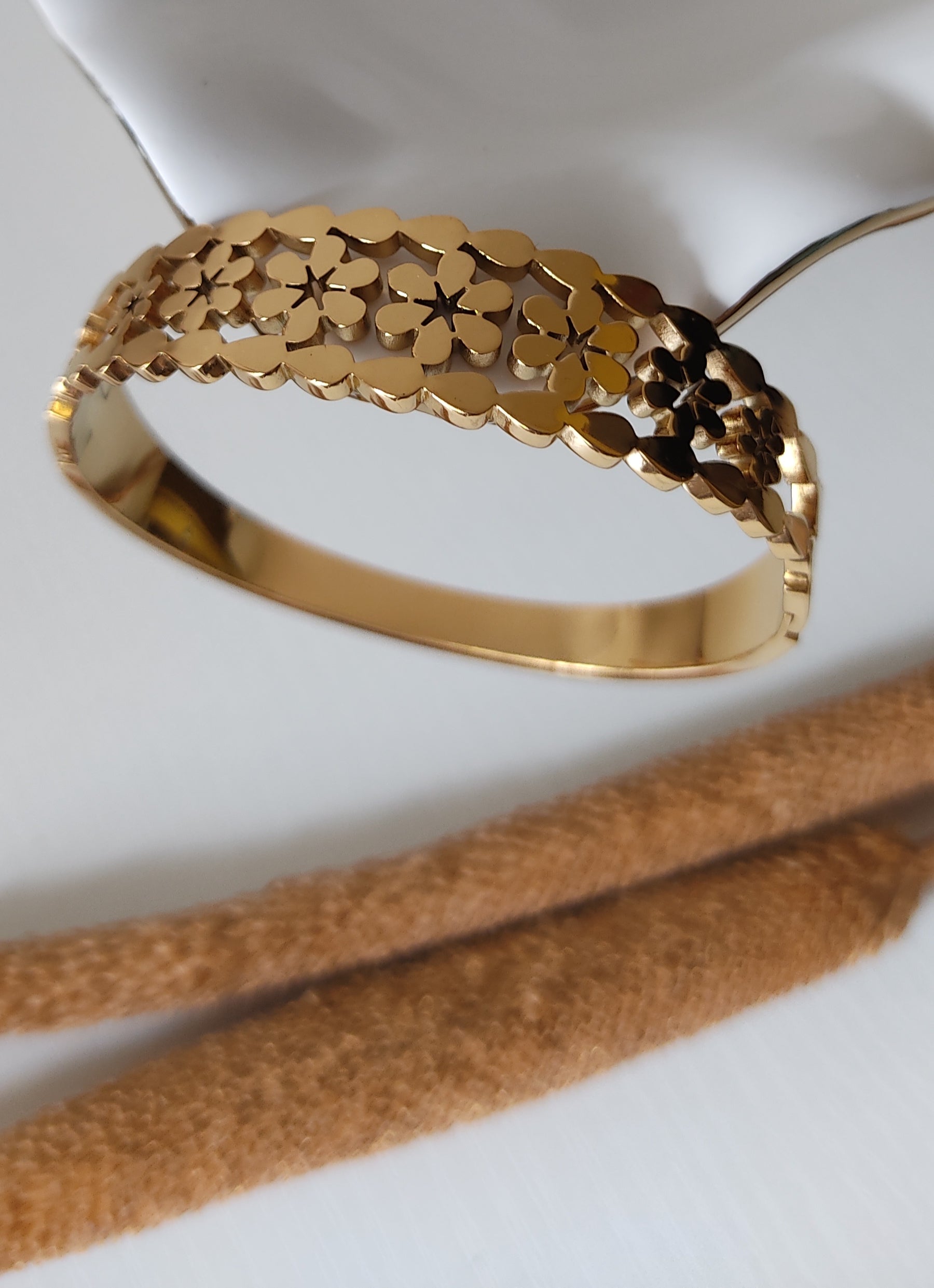 Embrace elegance with this gold-plated bangle bracelet featuring an intricate floral lace cutwork design. The delicate interconnected flowers create a stunning statement, making it an ideal accessory for both festive occasions and daily wear.