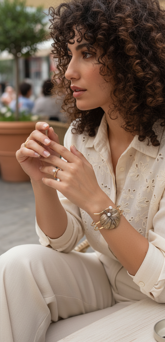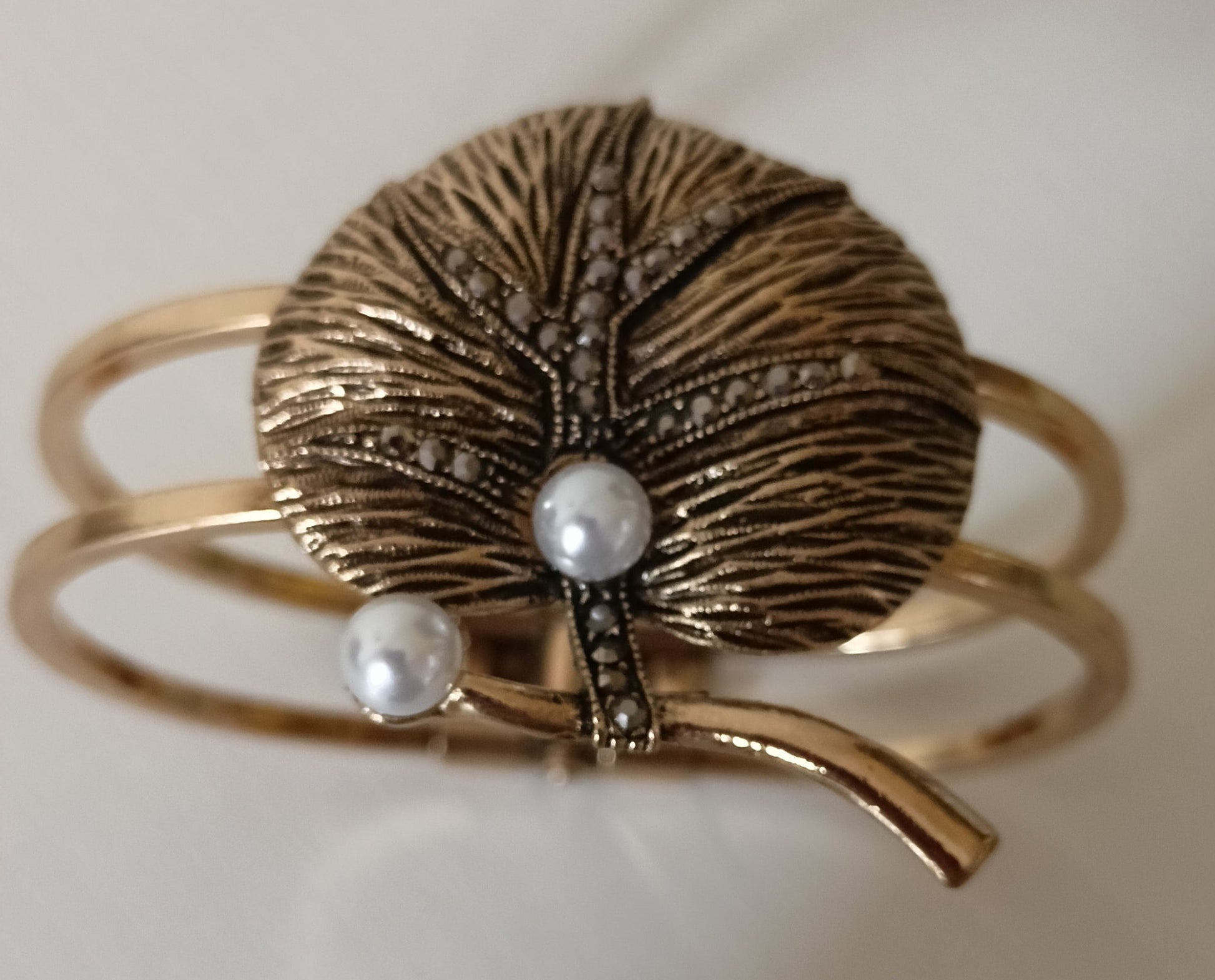 Enchanting dual-cuff bangle bracelet featuring an intricate leaf motif adorned with pearl embellishments. Crafted in warm gold-tone metal with detailed filigree work and delicate beading, this vintage-inspired piece showcases exceptional craftsmanship. The adjustable open-end design accommodates all wrist sizes, making it a perfect statement accessory for weddings, parties, and special occasions.