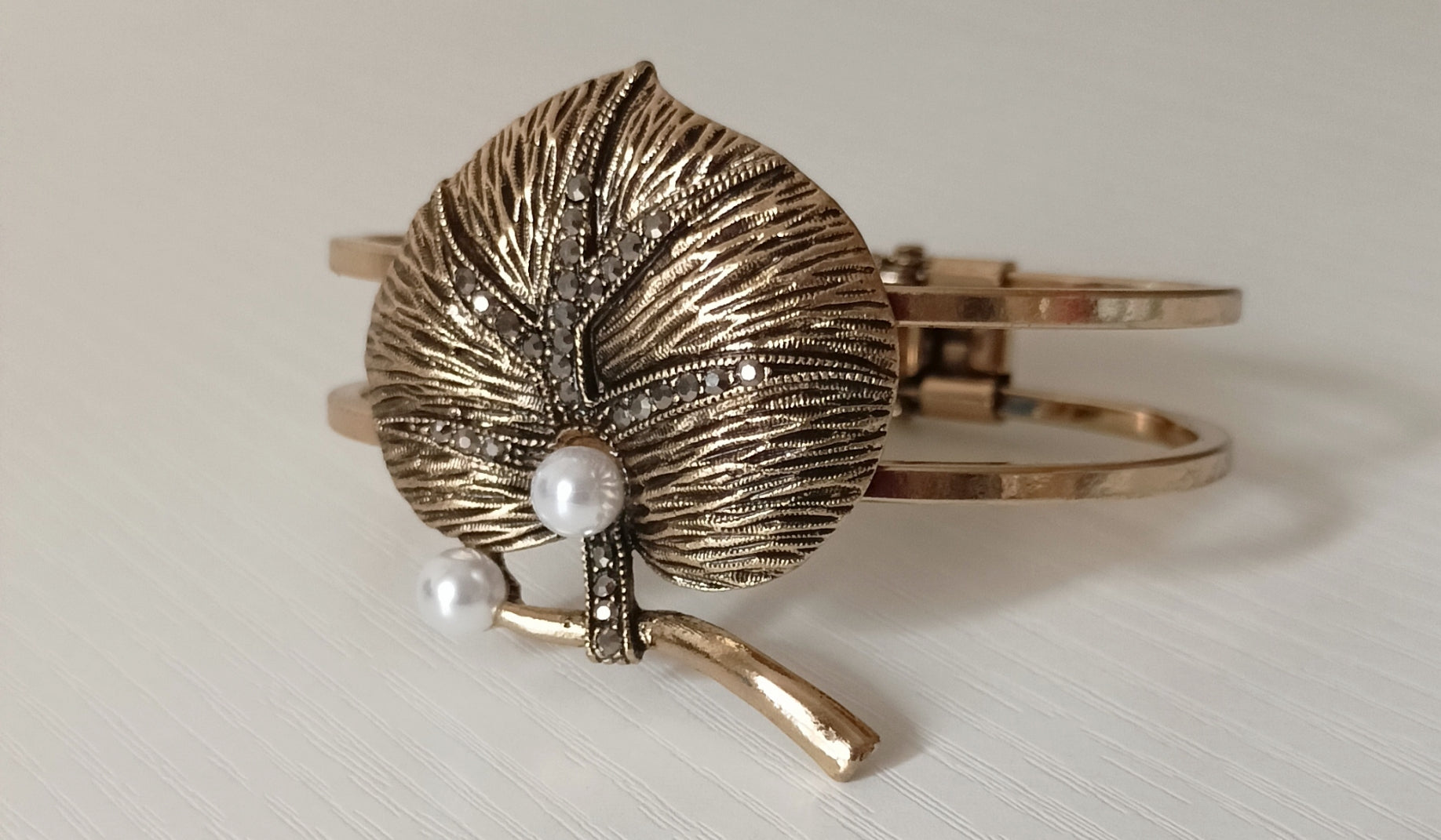 Vintage Gold Leaf with Pears Cuff Bracelet | Vintage Filigree Statement Cuff