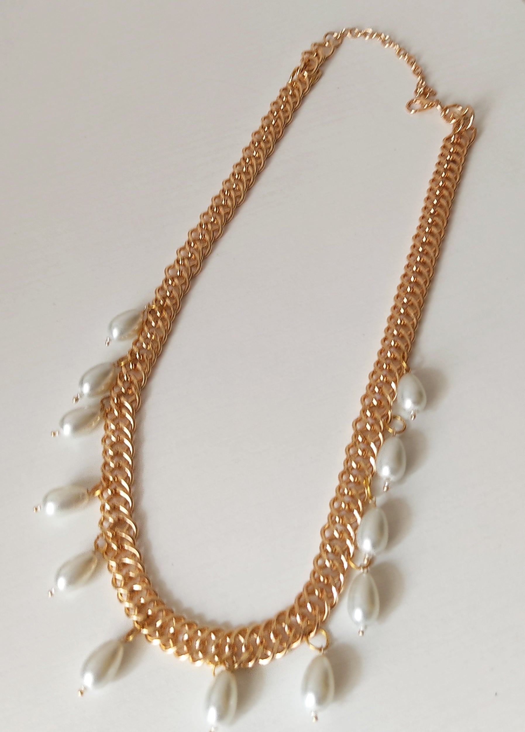 A chic gold-tone chain collar necklace adorned with sleek white teardrop pearl drops for a graceful, feminine look. Perfect for elevating everyday outfits, date nights, and partywear with a touch of classic charm.