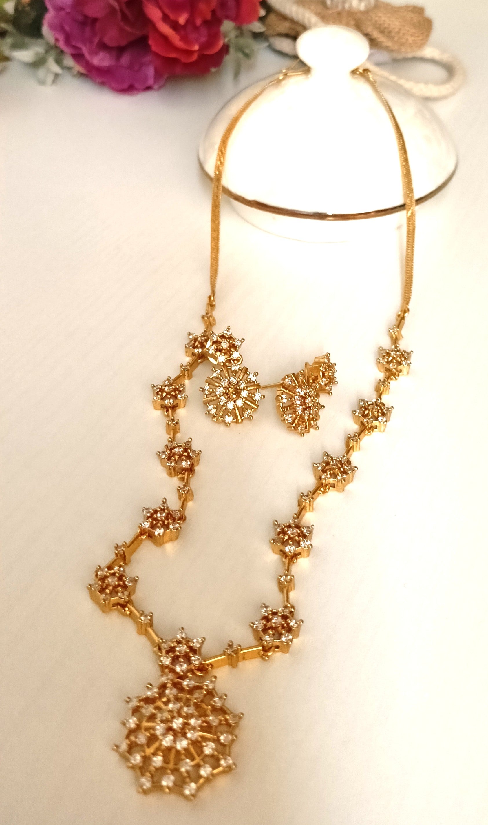 This elegant necklace set includes a beautifully crafted gold-tone necklace and matching earrings, both featuring intricate starburst motifs inlaid with sparkling white stones. The necklace is adorned with a series of floral-inspired clusters that create a harmonious, radiant effect, while the earrings mirror the starburst design for a coordinated look. Perfect for festive occasions, weddings, or adding a touch of glamour to any outfit.