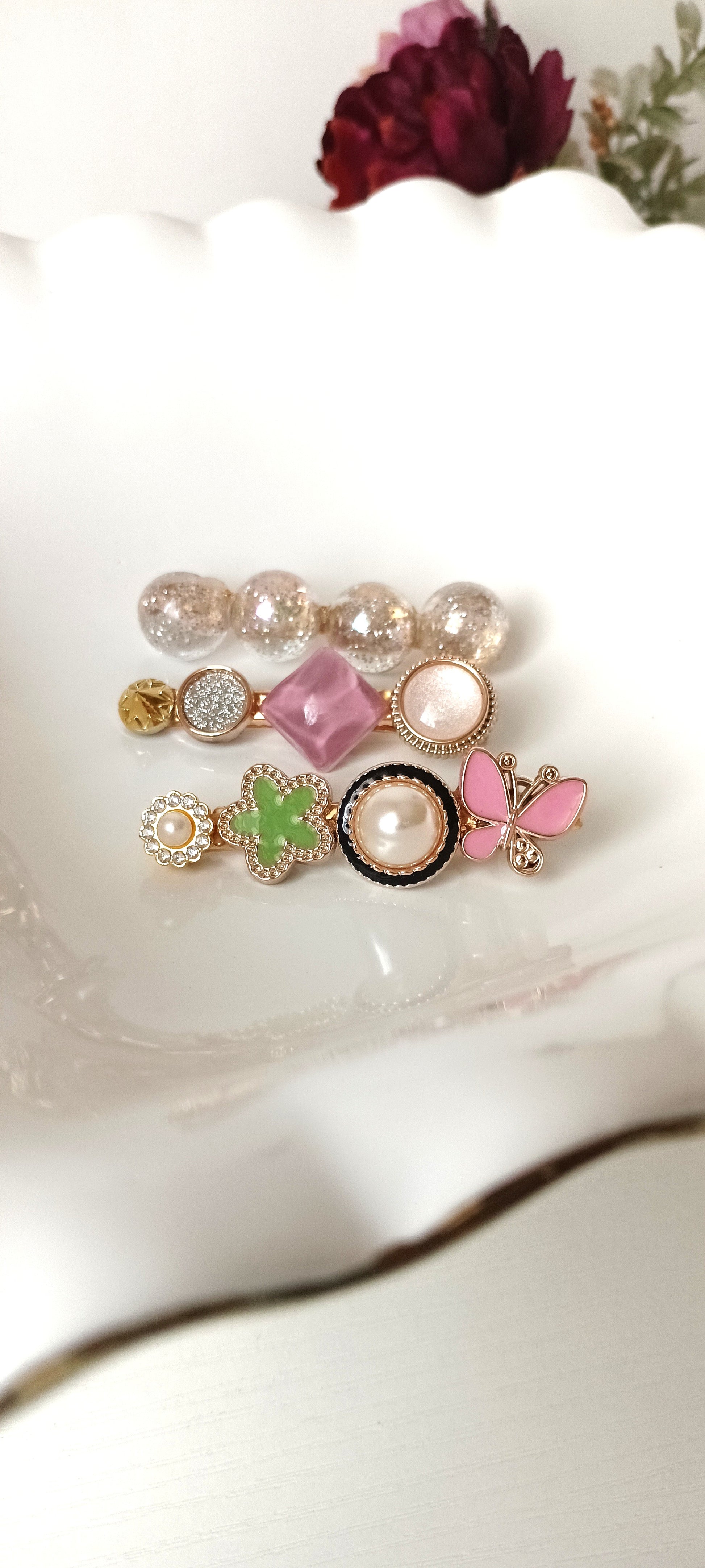Elevate any hairstyle with this playful hair clip set, featuring a pastel pink butterfly, faux pearls, glittering beads, and floral accents. Perfect for adding a pop of color and charm to everyday looks or special occasions, these clips blend whimsical design with elegant detailing for a standout accessory collection.