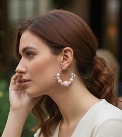 Add a touch of elegance to your look with this handcrafted jewelry set, featuring pastel pink and beige textured thread beads, natural beige wooden beads, lustrous pearls, and delicate silver floral charms. Perfect for ethnic or contemporary outfits, this set includes a matching necklace and hoop earrings, designed to make you stand out at any occasion.