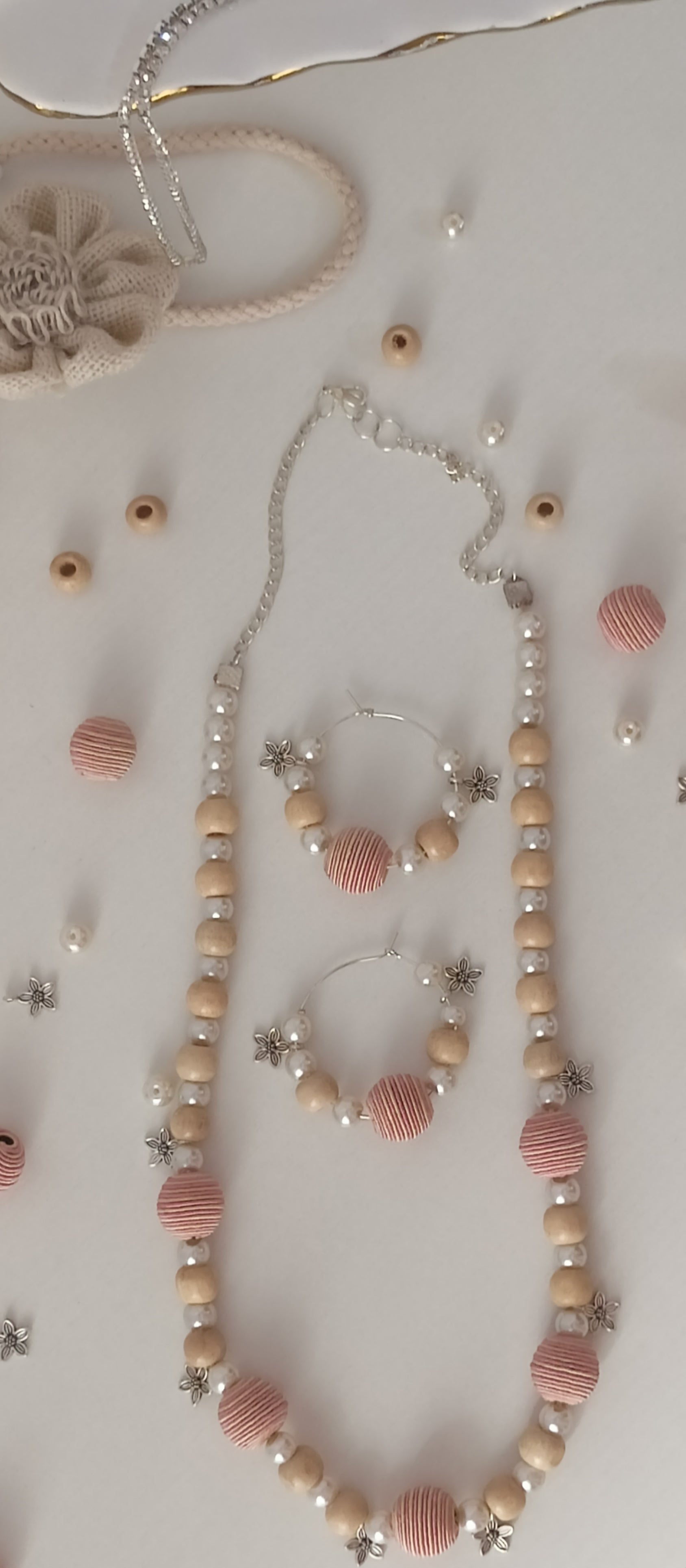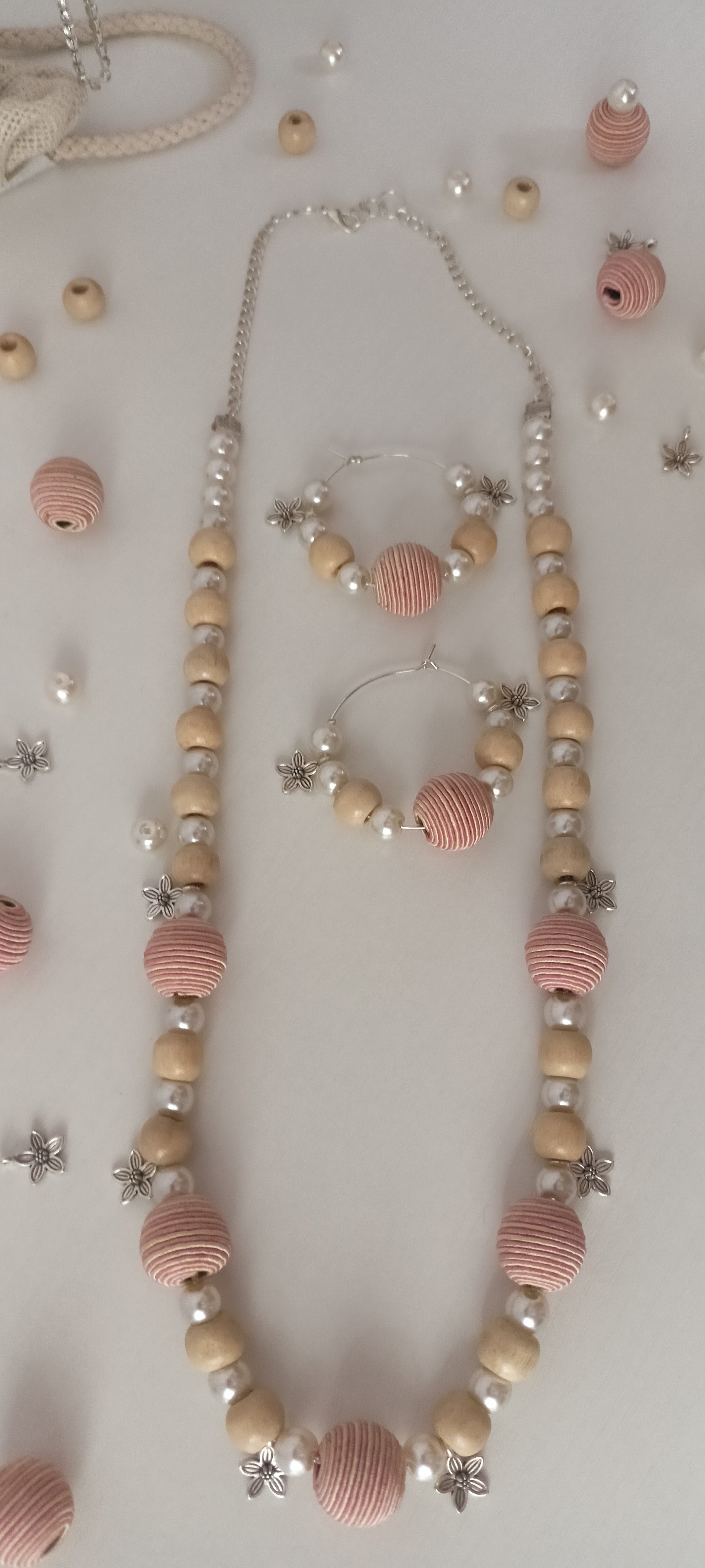 Handcrafted Pastel Pink & Beige Wood & Thread Beads Jewellery Set - Personally Handcrafted