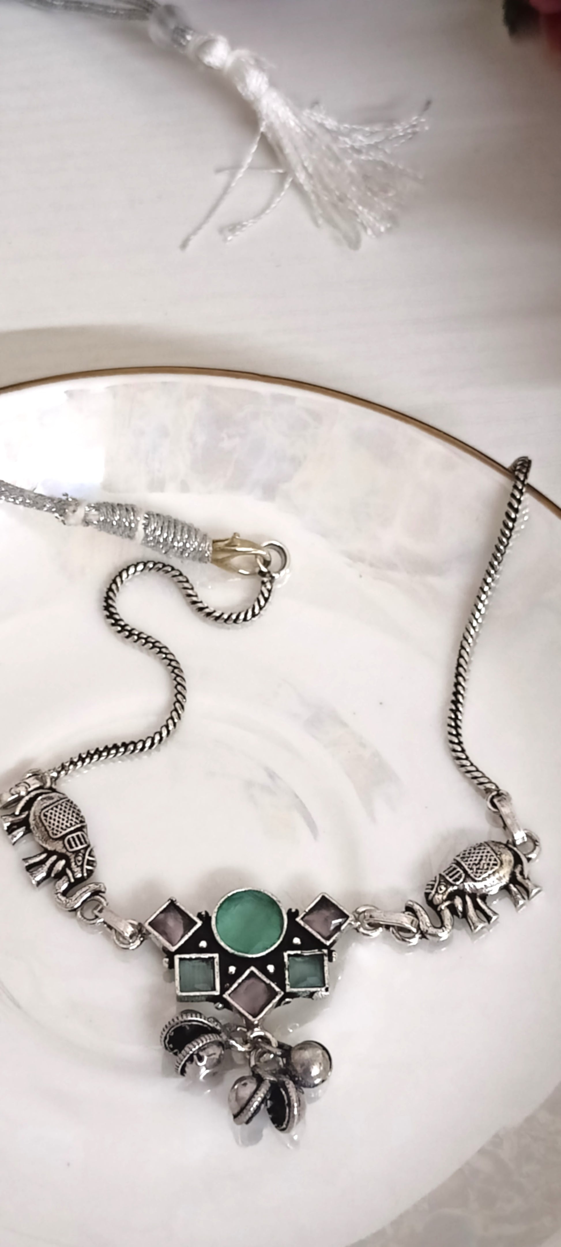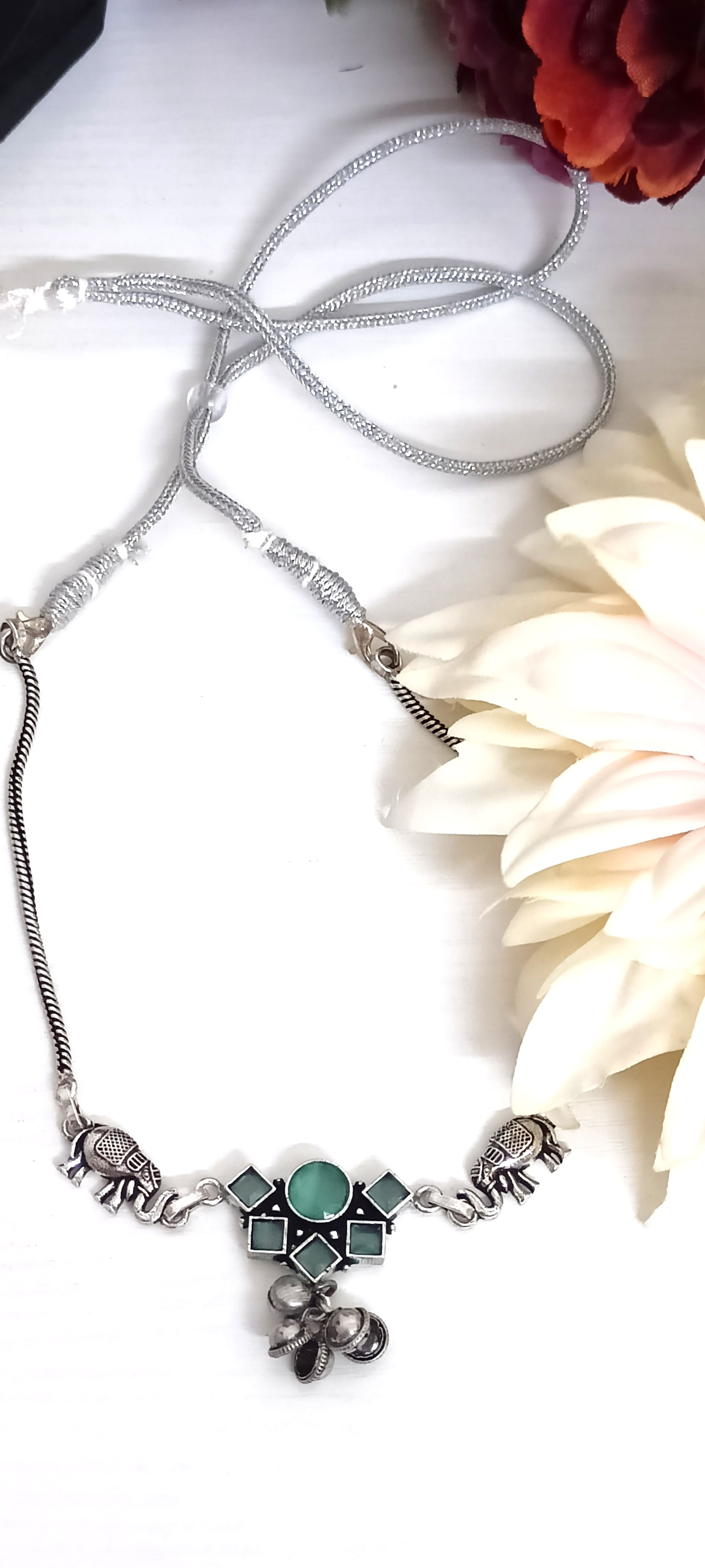 Blend tradition with style in this oxidised silver necklace, adorned with elephant motifs and a geometric green stone pendant. Finished with classic ghungroo charms and a silver cord, this piece is perfect for adding a touch of elegance to both ethnic and casual outfits.
