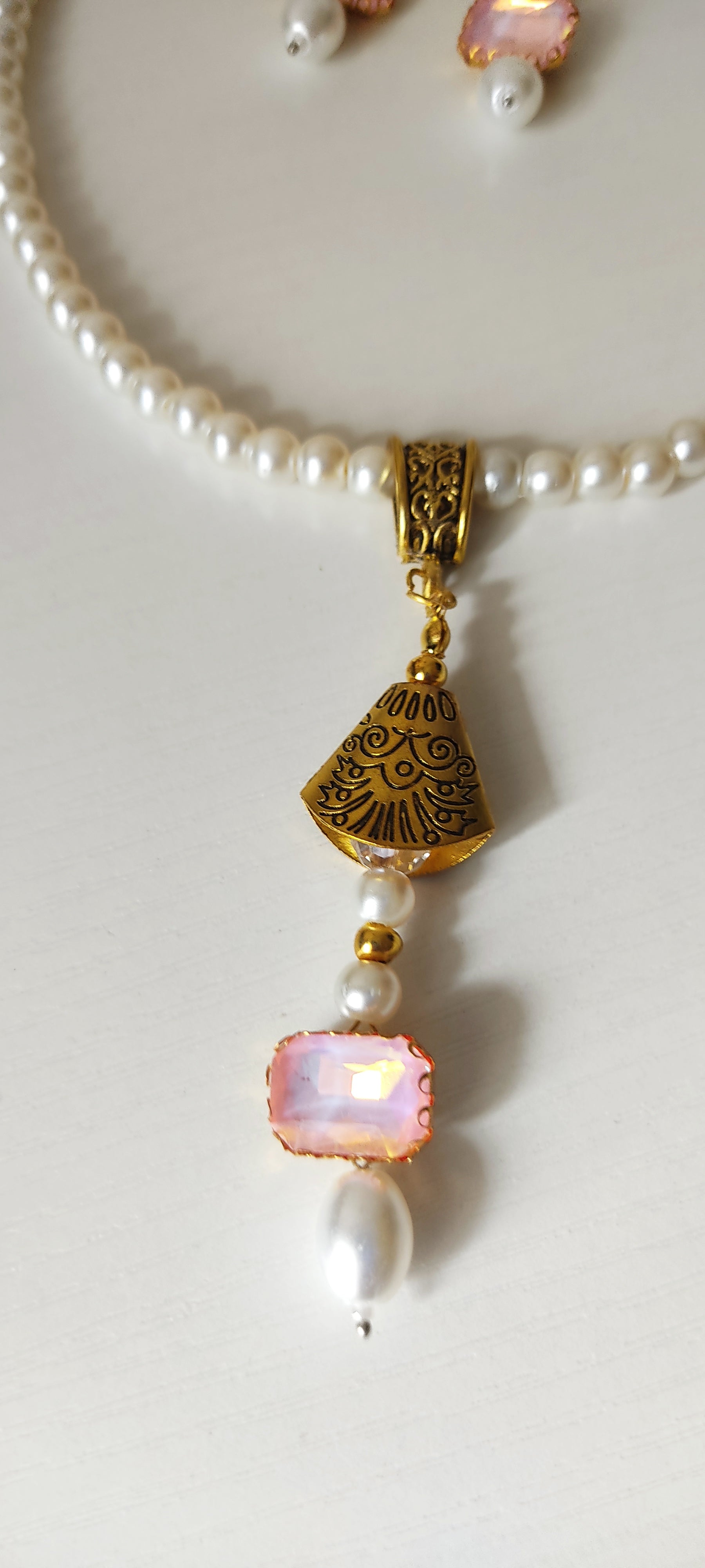 Elegant pearl necklace set featuring a single strand of glossy white pearls, a carved gold-tone cone pendant, and a pastel pink opal-style crystal drop with matching pearl earrings. Perfect for festive wear, ethnic outfits, and special occasions.