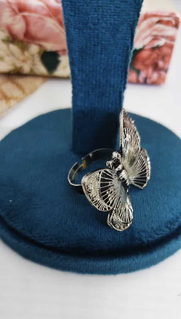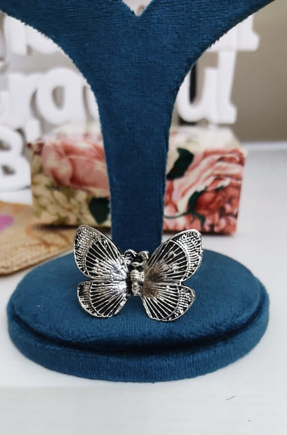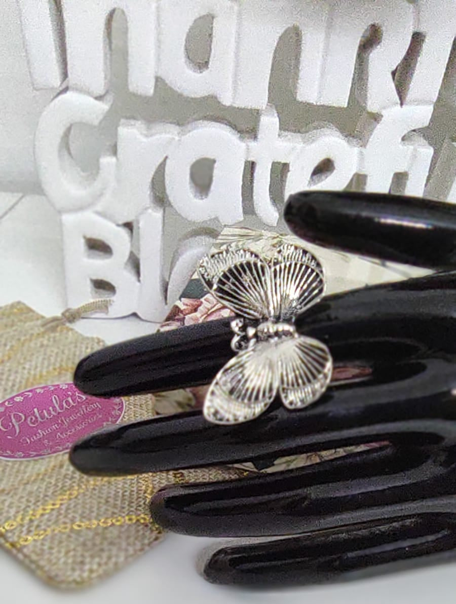 This striking statement ring features a beautifully detailed silver-tone butterfly with openwork wings, creating an eye-catching three-dimensional effect. The unique butterfly design sits elegantly atop the finger, making it a whimsical and stylish accessory perfect for adding a touch of charm to any look.