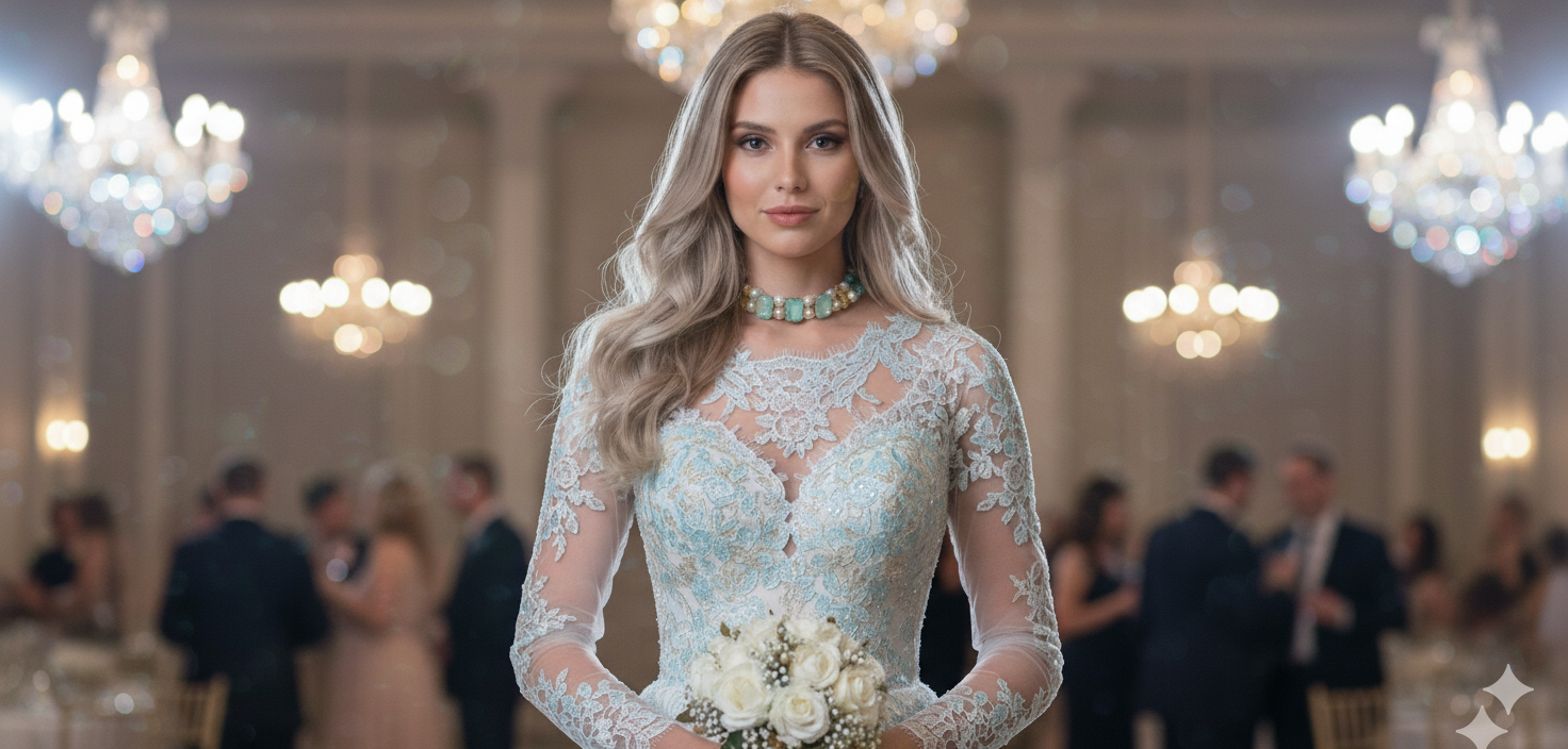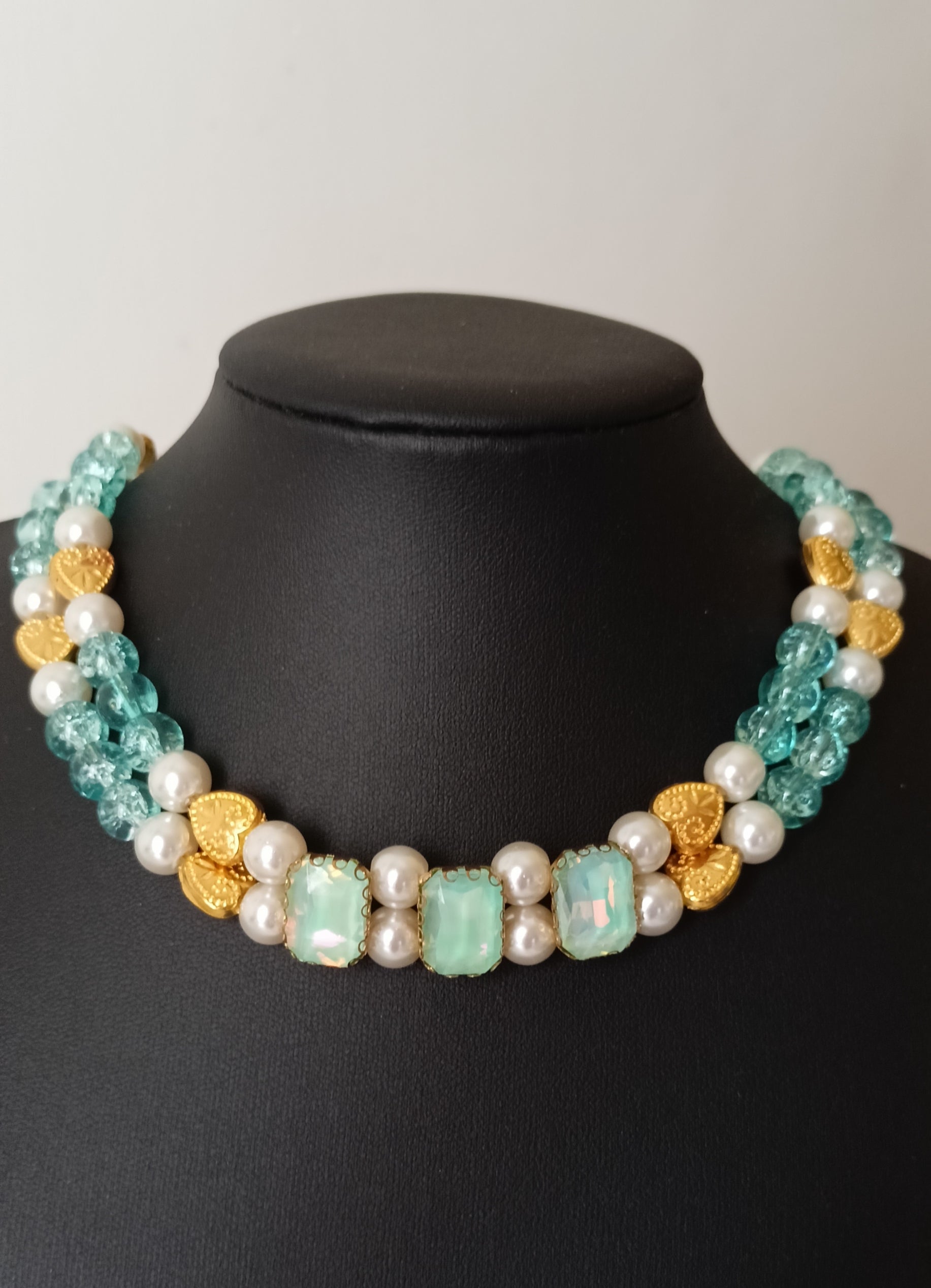 A charming double-strand choker featuring seafoam blue- green faceted crystals, glossy ivory pearls, and textured gold heart beads for a soft, romantic glow. Ideal for brunches, parties, and special occasions where a fresh, feminine statement is needed.