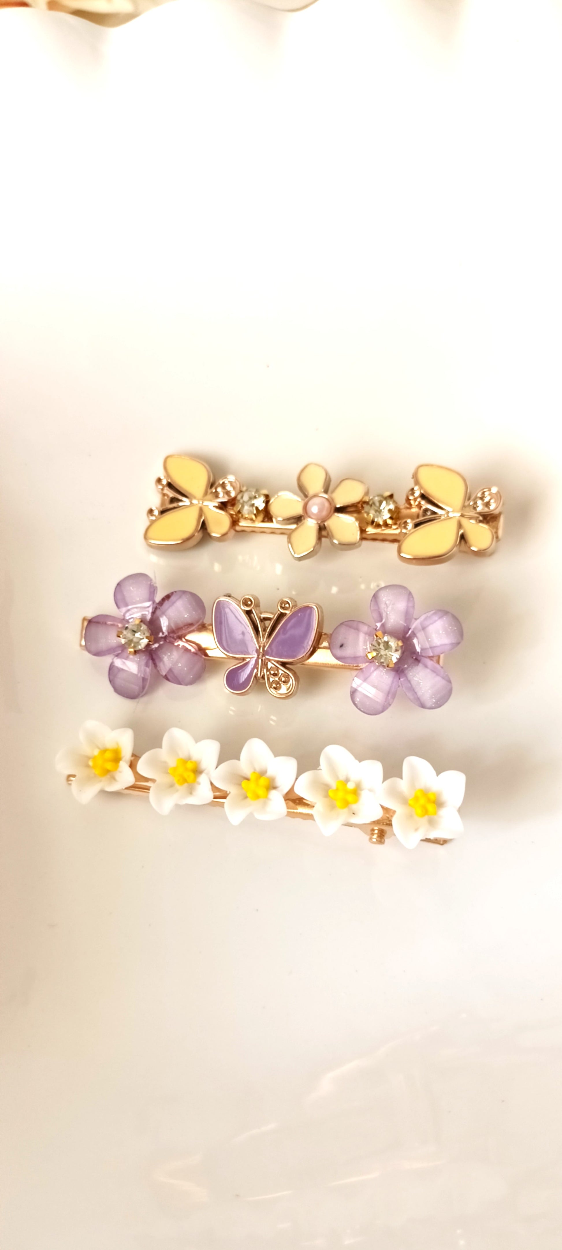 Celebrate nature with this charming hair clip set: cheerful white daisies with yellow centers, delicate lavender butterflies surrounded by flowers, and a soft lemon-yellow floral clip with rhinestone and pearl accents. Handpicked for spontaneous spring style, these pastel clips add a whimsical, feminine finish for girls and women alike.