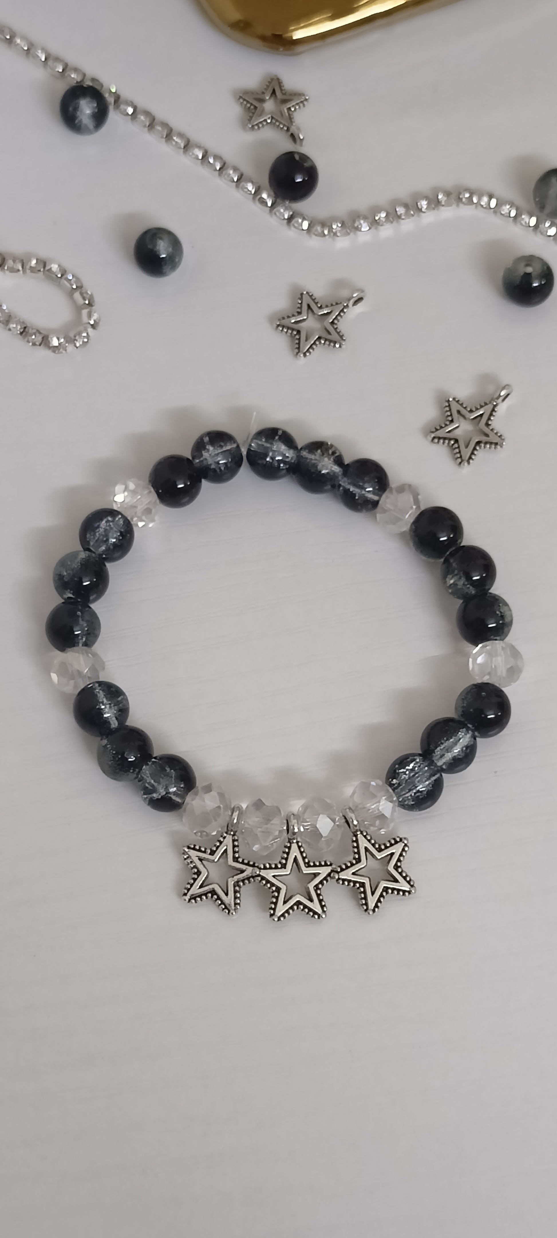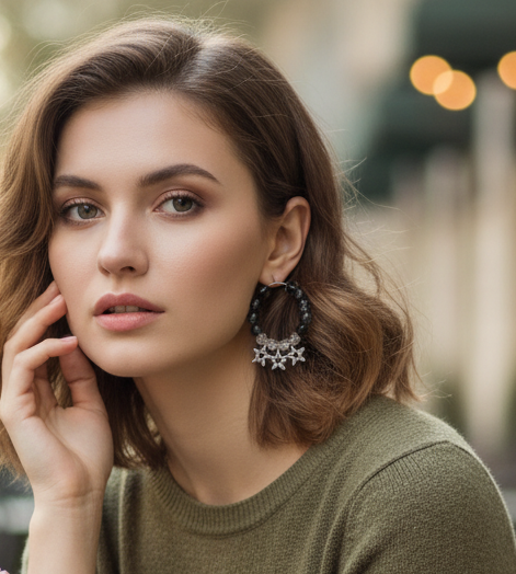 Add a touch of celestial elegance with this coordinated earring and bracelet set, featuring glossy black beads, sparkling clear crystal spacers, and detailed silver star charms. Perfect for making a statement with any outfit, this jewellery set blends modern chic with playful charm for fashion-forward occasions or everyday style.