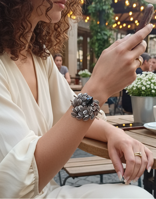 Vintage Black Stone Peacock Feather Oxidized Cuff Bracelet