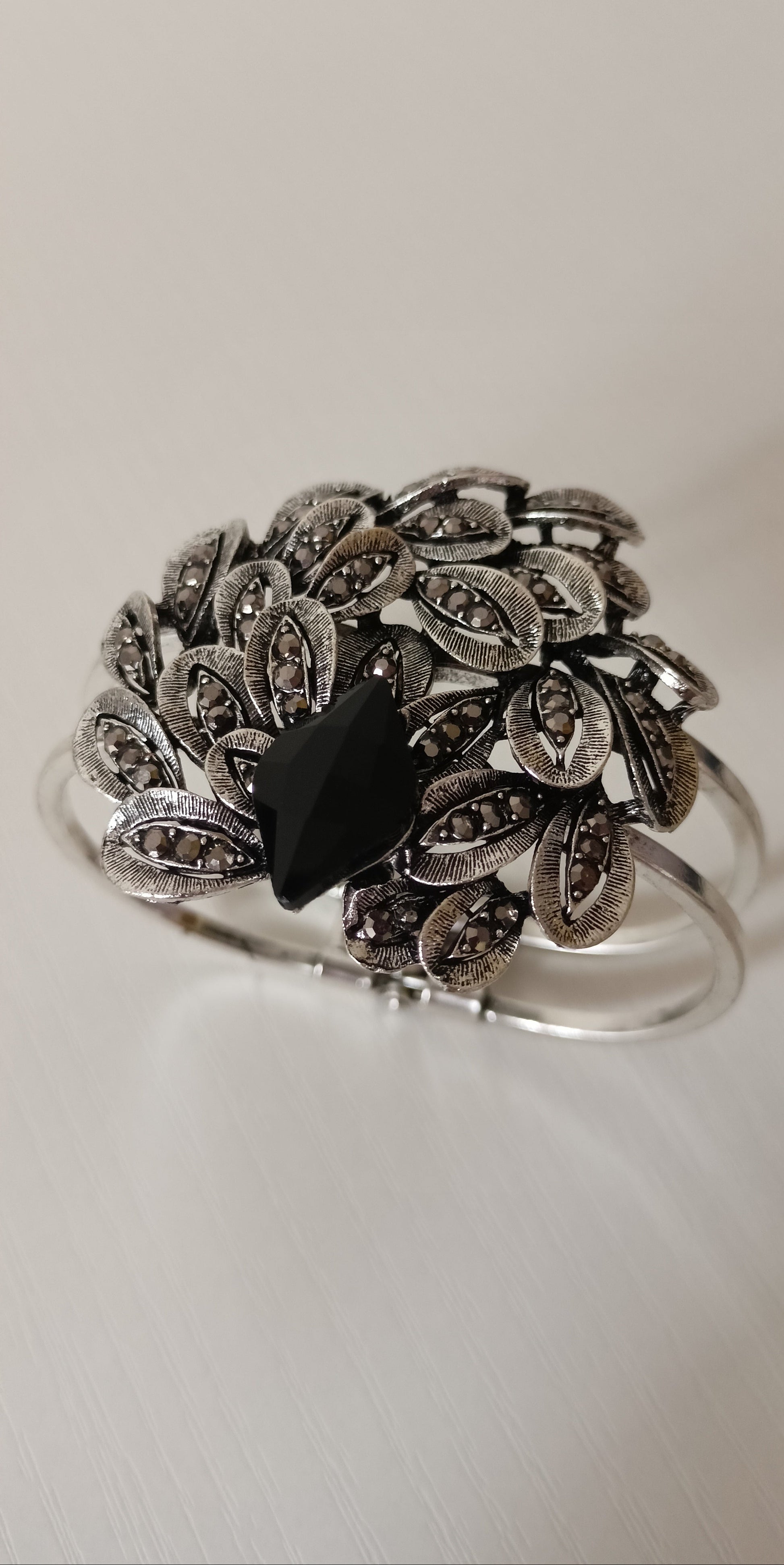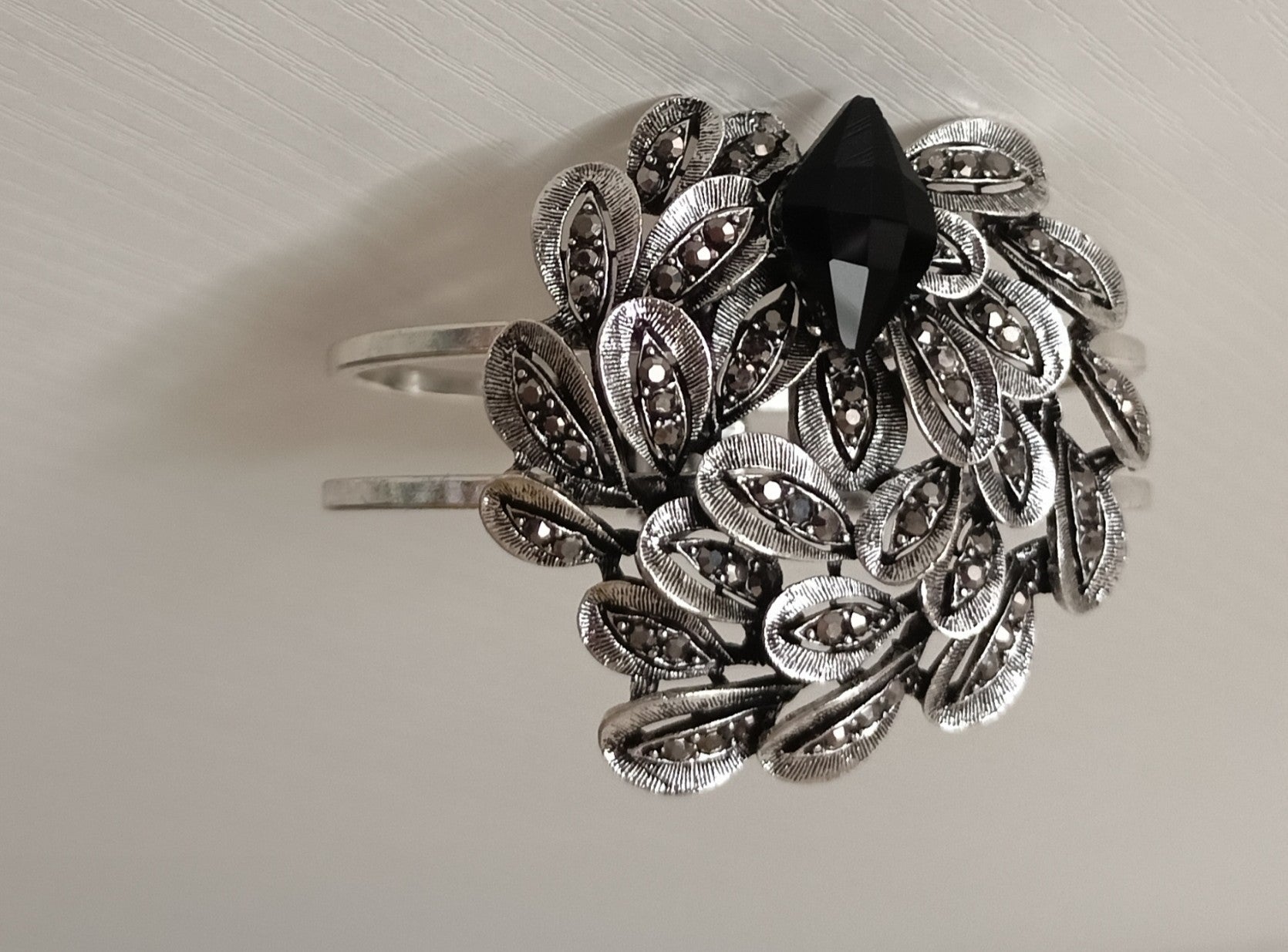 Exquisite statement cuff bracelet featuring an intricate peacock feather design in oxidized silver-tone metal. Centered with a teardrop black crystal stone, this vintage-inspired piece showcases elaborate filigree work with delicate leaf motifs adorned with marcasite-style embellishments. The adjustable cuff design ensures comfortable wear while making a bold fashion statement.