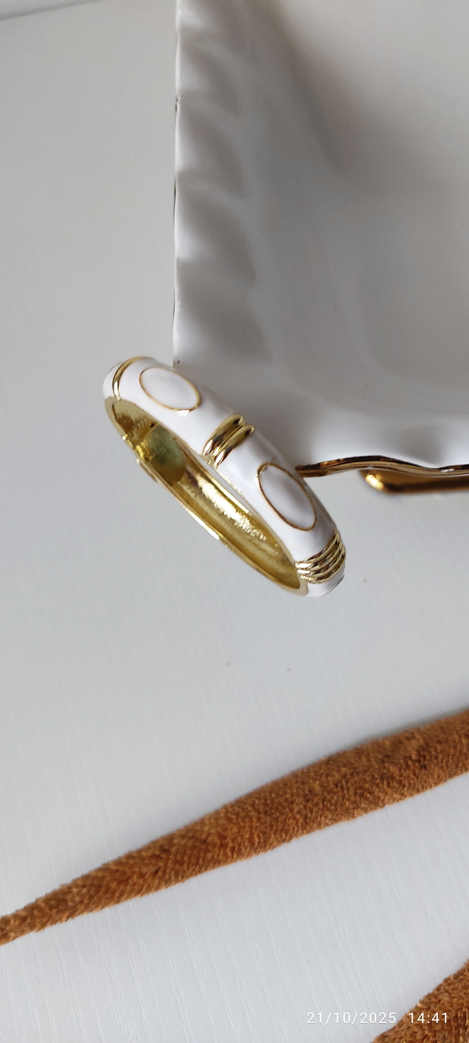 Make a bold statement with this sophisticated gold-plated bangle bracelet featuring a sleek white enamel finish and elegant oval accents. Modern details and a secure clasp make it an ideal accessory for both casual outings and special occasions.