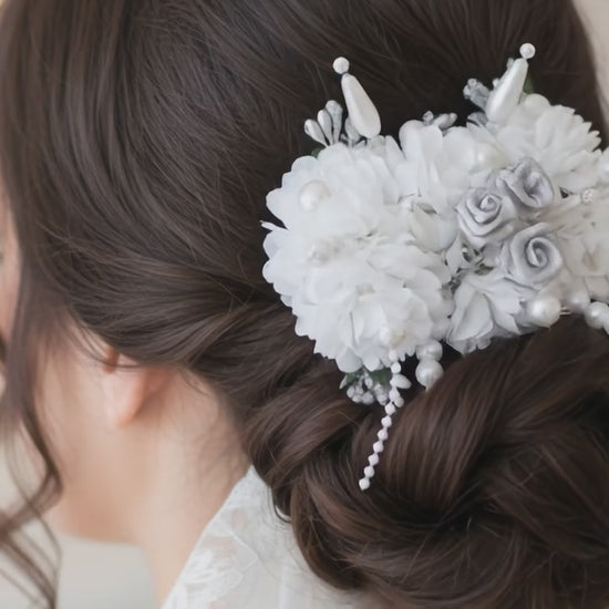 Transform your bridal look with this exquisite white floral hair accessory set featuring delicate fabric flowers, lustrous pearls, and shimmering silver accents. This handcrafted bridal hair ornament combines romantic white blooms with elegant pearl embellishments and metallic details, creating a timeless piece perfect for weddings, engagements, or special occasions. The versatile design complements both traditional updos and flowing hairstyles, making it an essential addition to your bridal jewelry collection